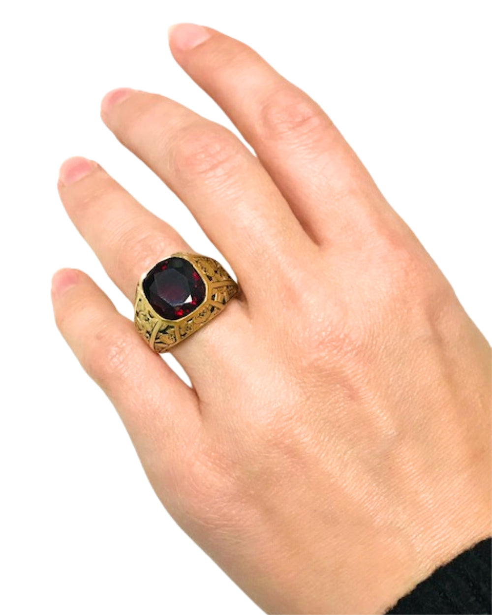 Garnet Ring Engraved 18k Gold Men Ring Cushion Cut