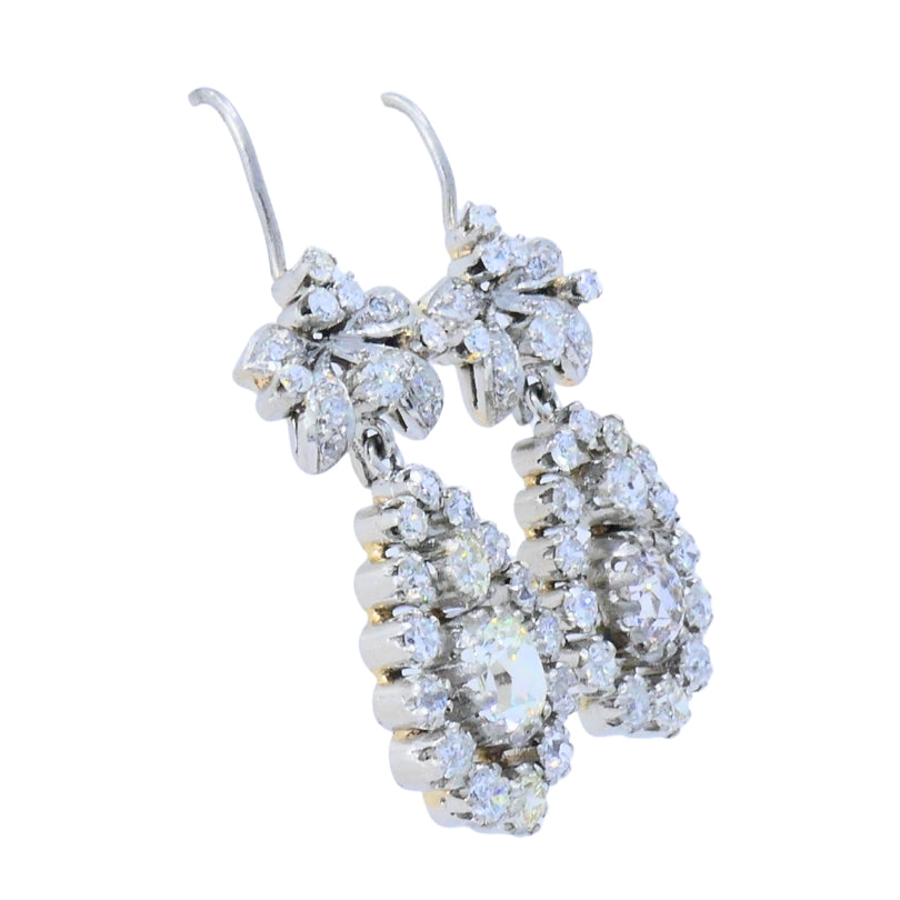 Each earring has a floral-inspired top section accented with smaller round diamonds. Below it hangs an open tear-drop shaped halo with a cushion cut diamond, framed by graduating Old European diamonds.