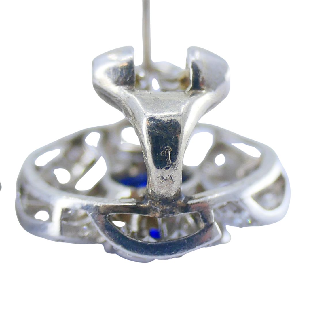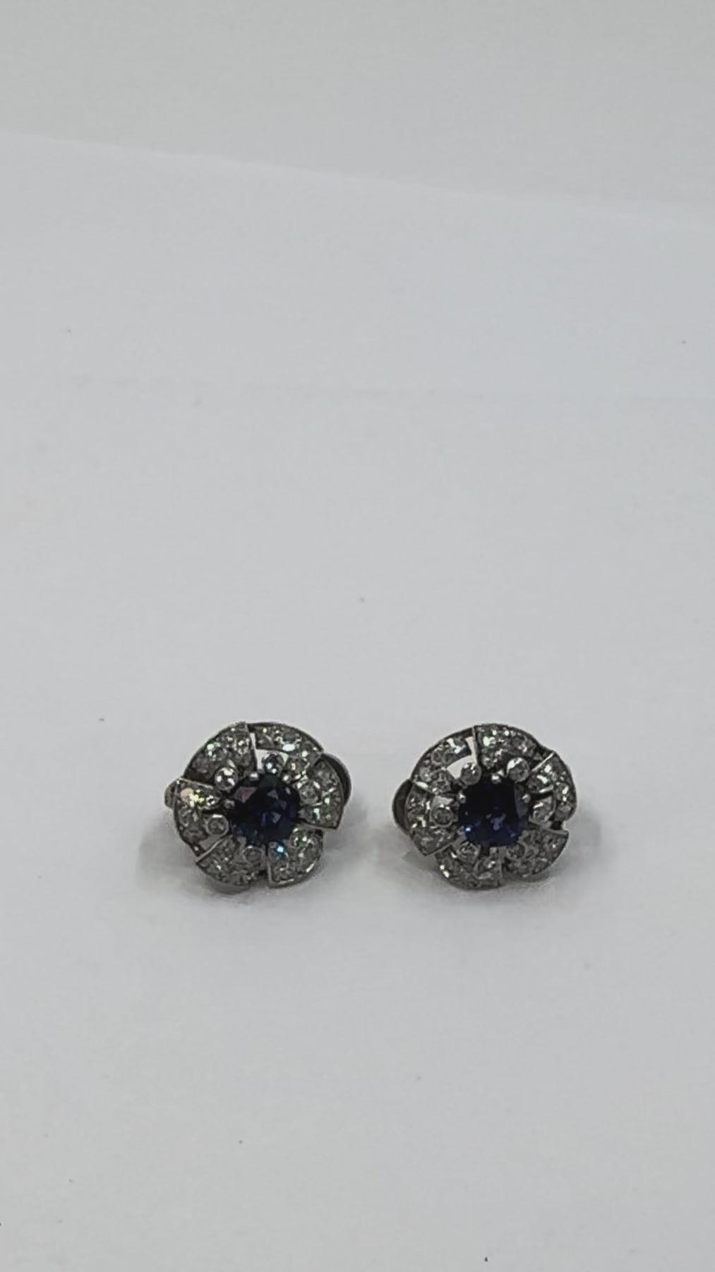 These vintage French earrings are crafted in platinum with a 18k white gold backing, bearing the French eagle head hallmark. Each earring features a vibrant round brilliant-cut sapphire at the center, weighing approximately 1.25–1.50 carats each, totaling an estimated 2.50–3.00 carats of sapphires. The sapphires are surrounded by a floral cluster of pavé-set diamonds, adding sparkle and enhancing the design’s depth.