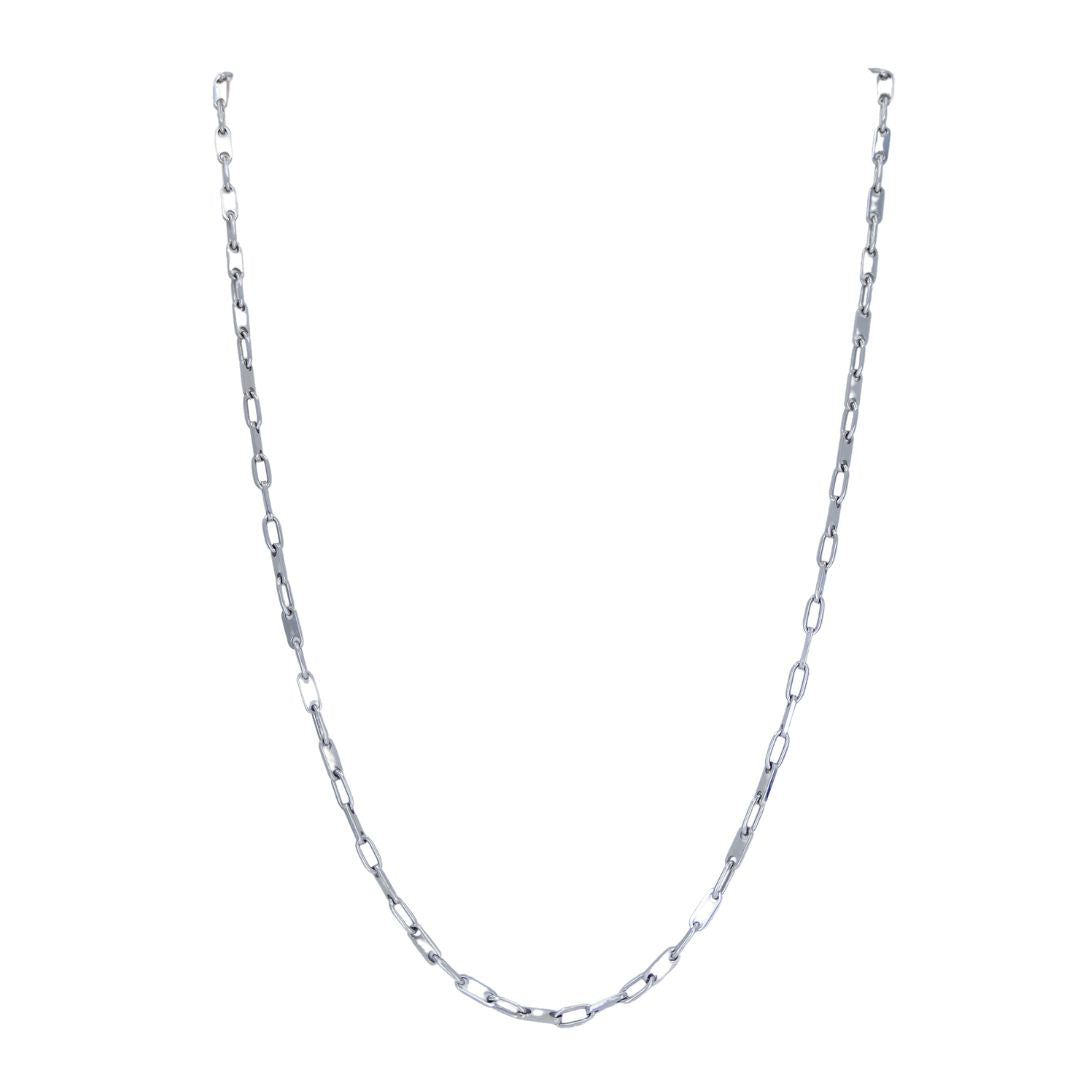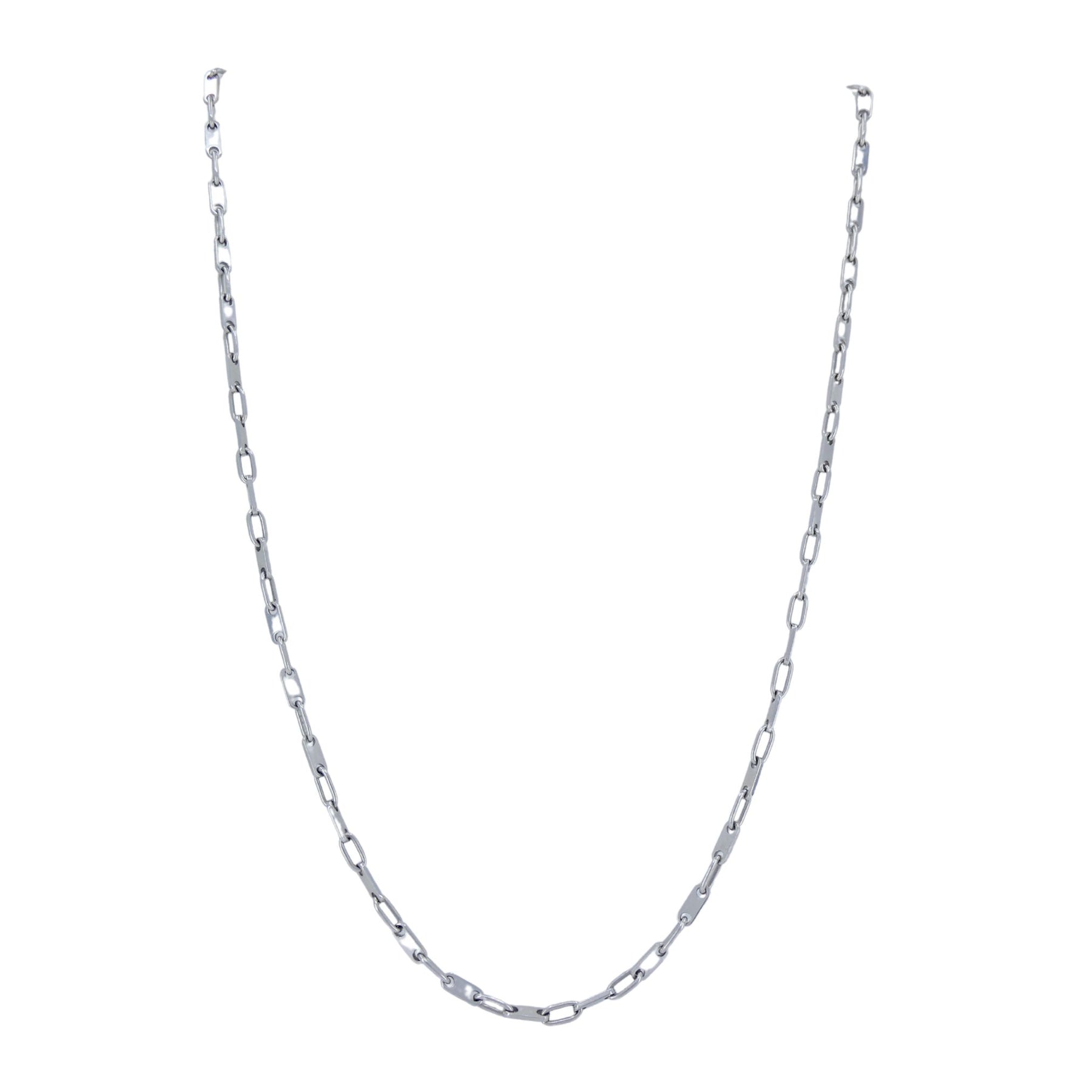 This 18k white gold biker chain necklace by KRIA, dating back to the 2000s, exemplifies the brand's commitment to blending natural inspiration with urban aesthetics. Measuring 28 1/4 inches in length and 1/8 inch in width, the necklace features an alternating pattern of open and closed links, creating a dynamic visual rhythm. Weighing 27.05 grams, it bears the signatures "KRIA," "750" (indicating 18k gold purity), and a unique serial number, attesting to its authenticity and craftsmanship.