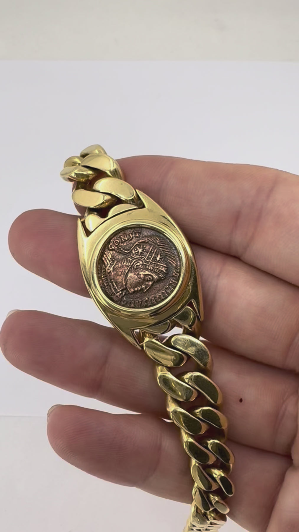 A beautiful vintage piece from Bvlgari’s celebrated Monete collection. This 18K yellow gold bracelet encapsulates the brand’s mastery of classical elegance and historical reverence. Centering an authentic ancient bronze Roman coin of Emperor Constantinus I (306–337 AD), the bracelet transforms a fragment of antiquity into a refined, wearable artifact.