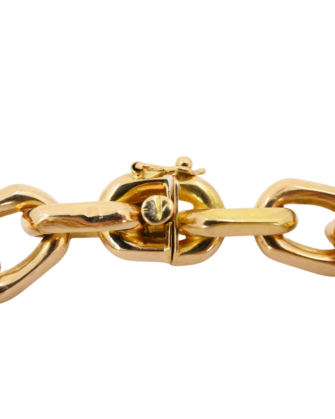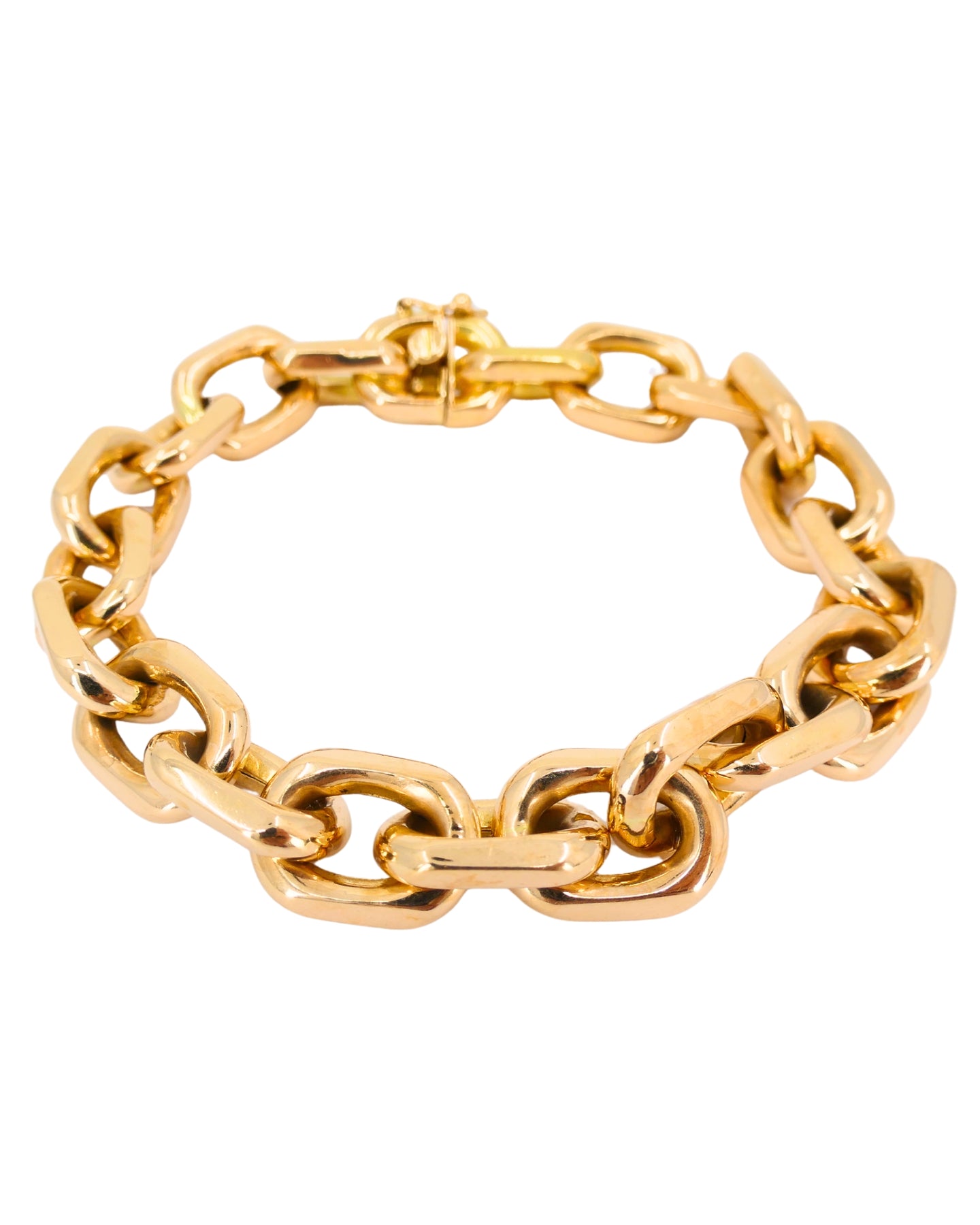 This vintage French bracelet is made of 18k rose gold and features a bold gold chain bracelet design with elongated rectangular links. Each link has softly rounded edges, giving the bracelet weight and presence.