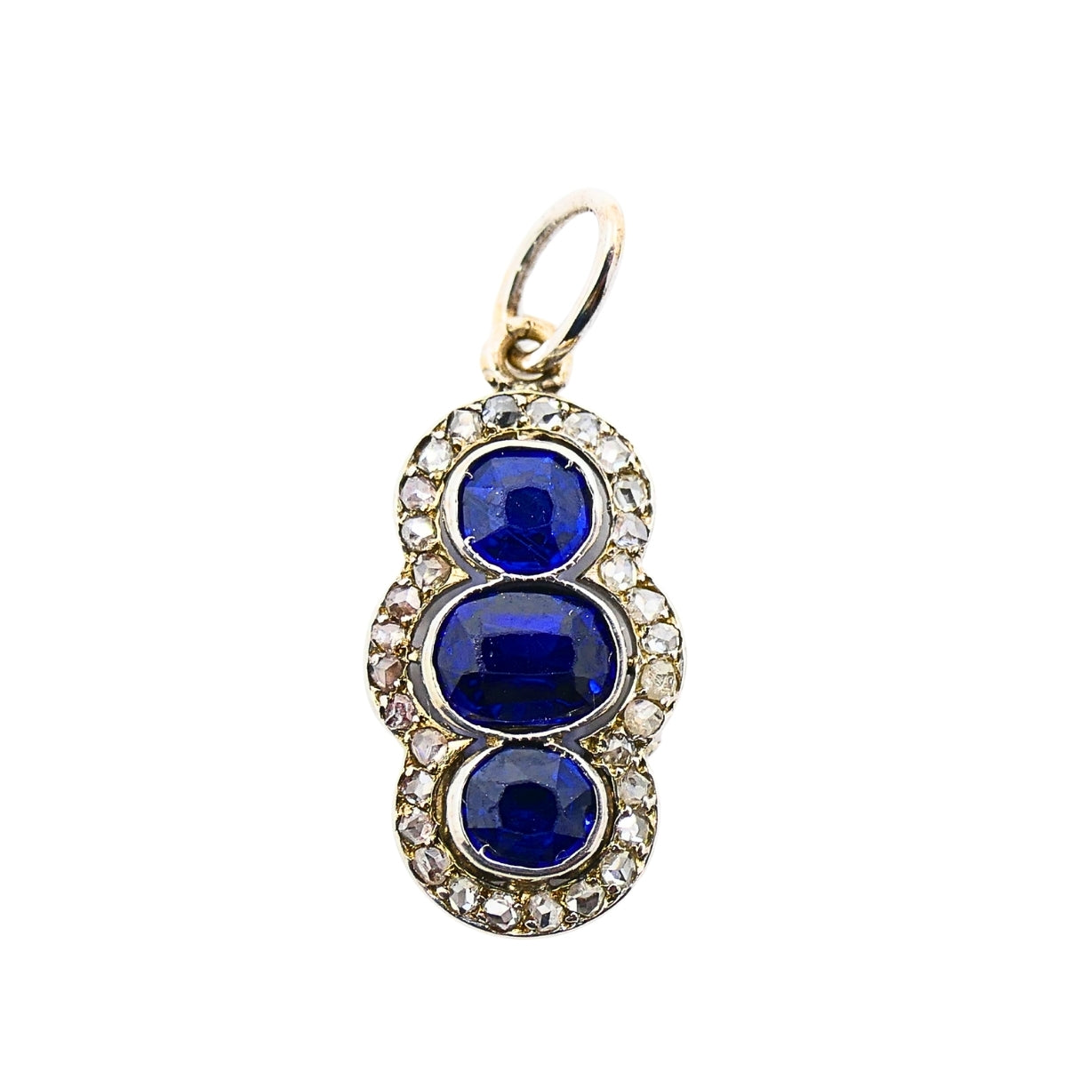 This petite sapphire and diamond charm pendant dates to the 1910s and combines rich blue color with a delicate antique halo of sparkling diamonds. Measuring approximately 3/8 inch by 9/16 inch and weighing 1.2 grams, it is an ideal scale for wearing on a fine chain or adding to a curated charm bracelet.