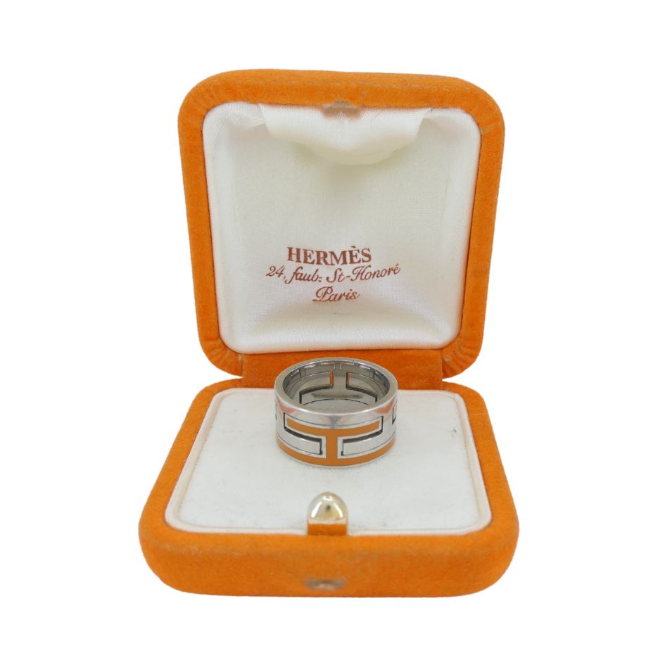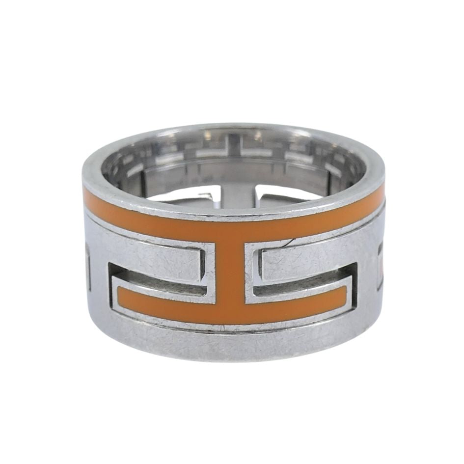 This authentic Hermès H motif ring features a bold geometric design in sterling silver with vibrant orange enamel inlay. Crafted circa 2004, the wide band showcases Hermès’ signature “H” cutout pattern encircling the ring, a hallmark of the house’s modern design sensibility. The ring measures 3/8" in width, weighs 7.6 grams, and is a European size 53 (US 6.5). The interior is stamped “HERMÈS,” “A.D,” “Ag925,” and “53.” This ring is not resizable. It comes complete with its original Hermès box, which bears the 24 Faubourg Saint-Honoré, Paris marking. Surface scratches are present on the metal, consistent with age and wear.