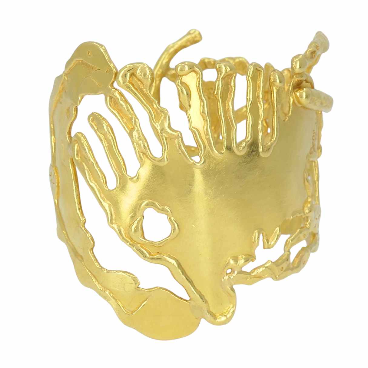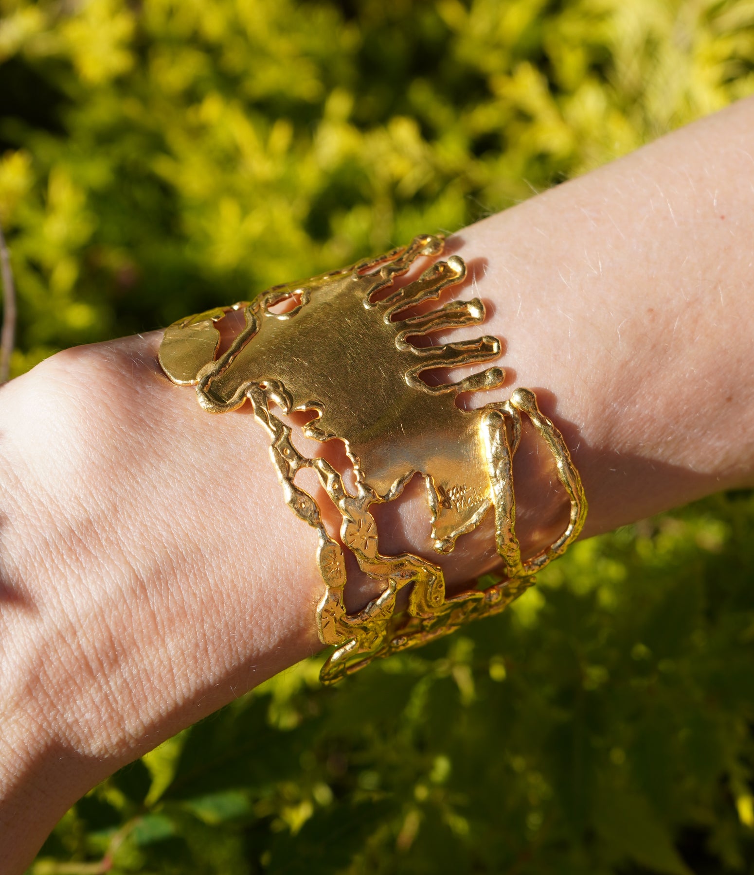 This signed Jean Mahie cuff is crafted in rich 22k gold and showcases the artisan’s unmistakable hand-wrought aesthetic. The openwork design reflects Mahie’s sculptural approach, where each element is shaped individually rather than cast, giving the piece its organic contours and expressive texture. Measuring 4 5/8" in length and 1 7/8" in width, the cuff fits up to a 6" wrist and weighs 49.1 grams. The bold, fluid form speaks to Mahie’s longstanding emphasis on ancient influences and abstract motifs, echoing the atelier’s deep connection to classical and Near Eastern art. Stamped Jean Mahie, it represents the collaborative studio’s commitment to one-of-a-kind workmanship and the use of high-karat gold that has defined their jewelry since the early 1970s