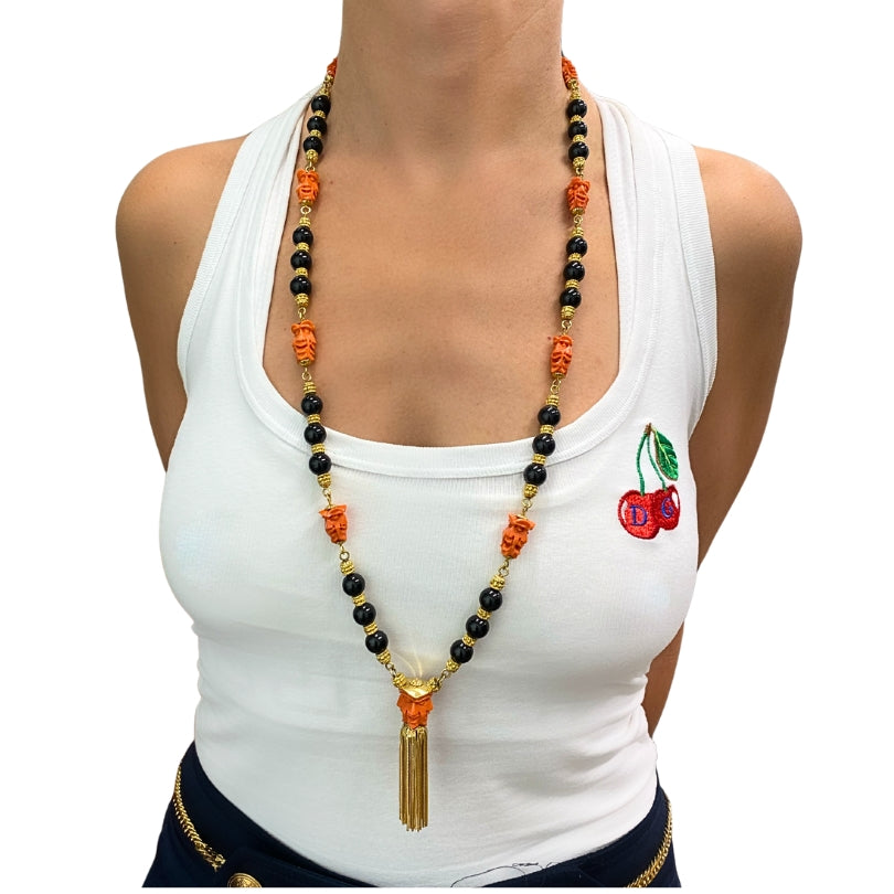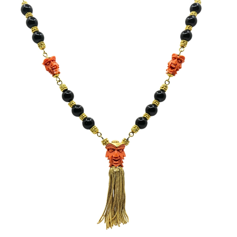 Vintage 18k Gold Carved Coral Devil Mask Onyx Tassel Necklace