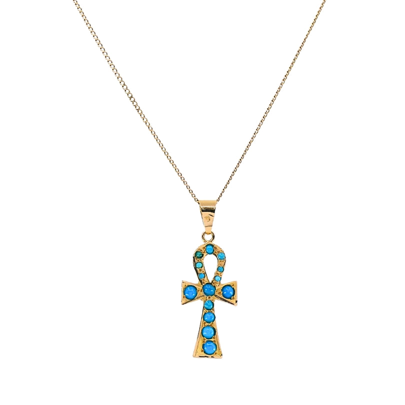 Vintage 21k Gold Turquoise Ankh Pendant 14k Gold Chain Necklace