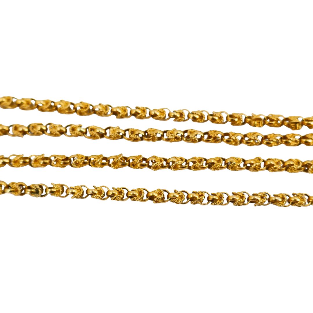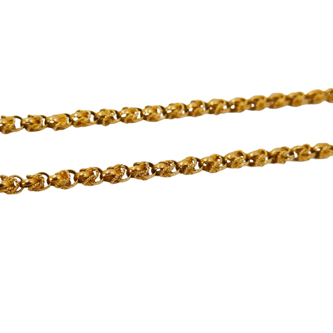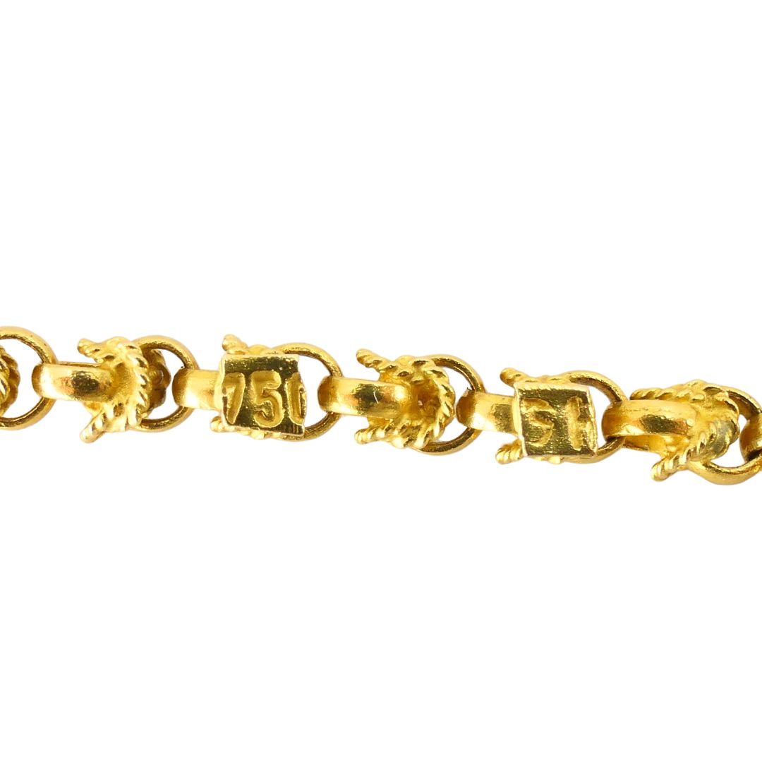 Suspended from a 30-inch chain, this necklace carries an equally luxurious touch. The chain is stamped 750 for 18k gold and weighs 23.1 grams, with a unique link that complements the pendant beautifully. Together, the pendant and chain total 45.6 grams of gold, making this piece a statement of craftsmanship and enduring value.