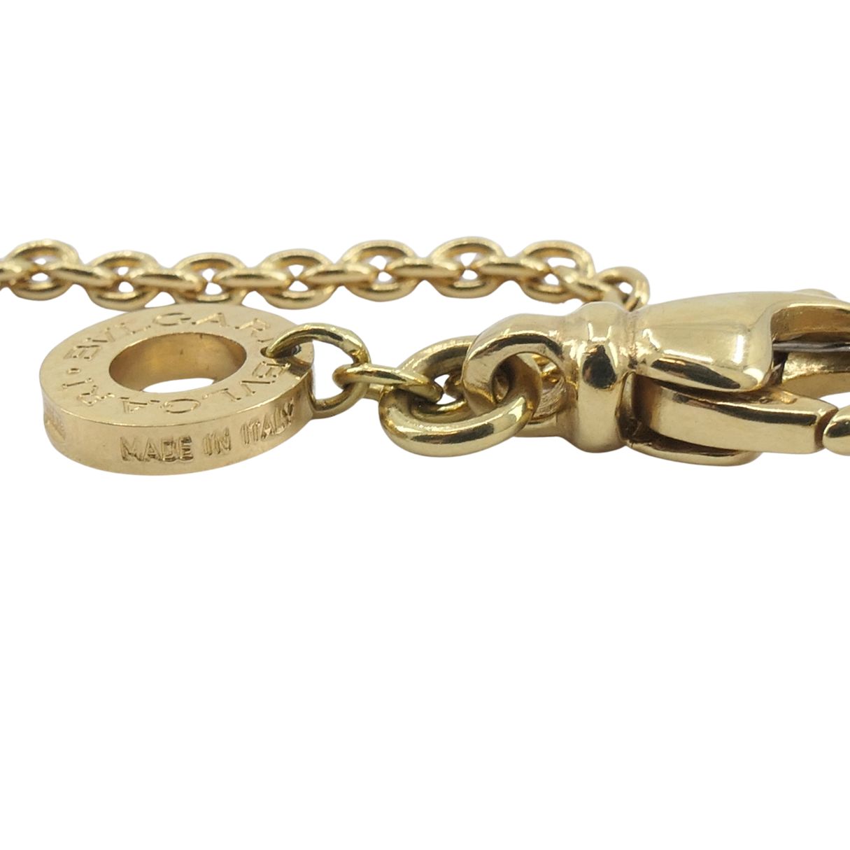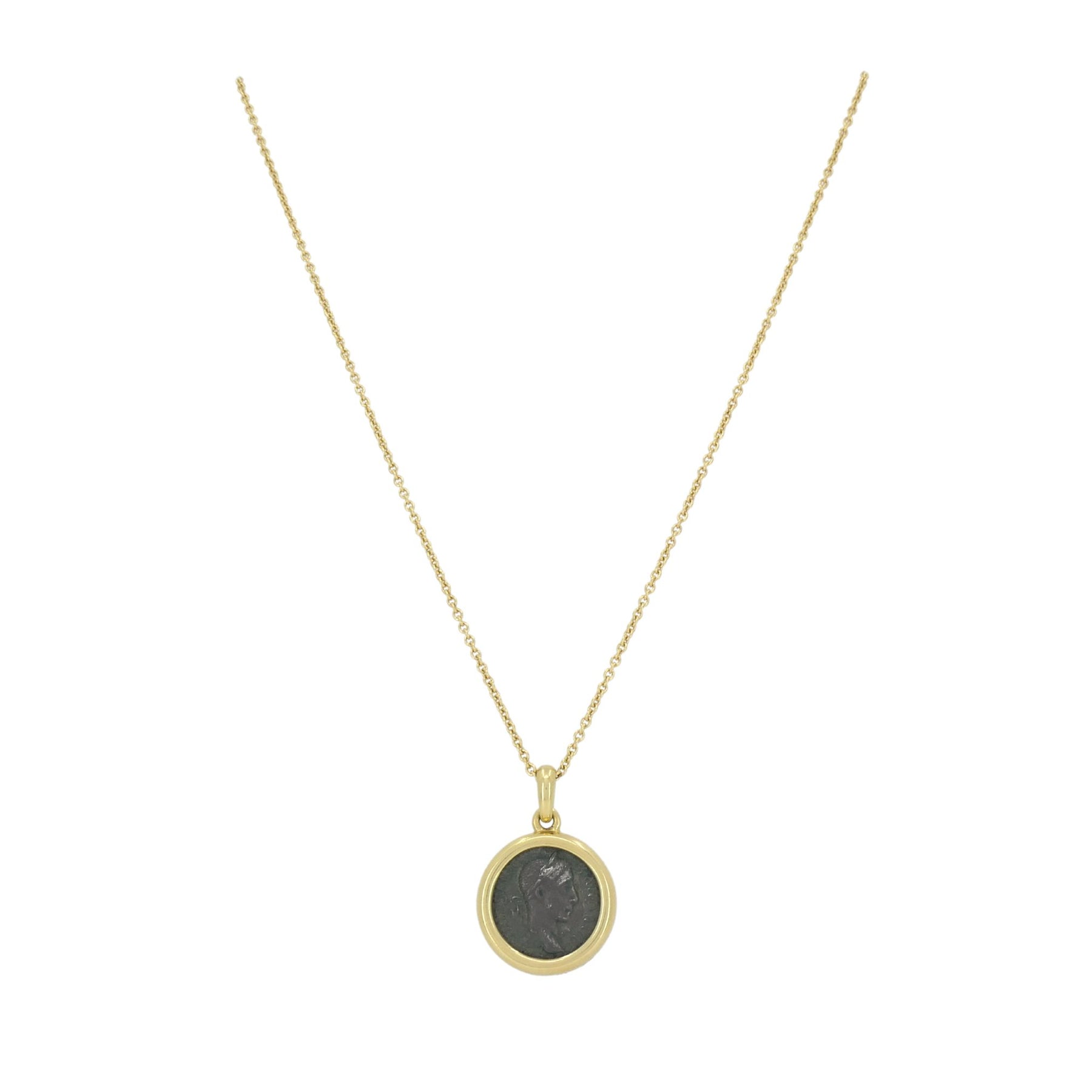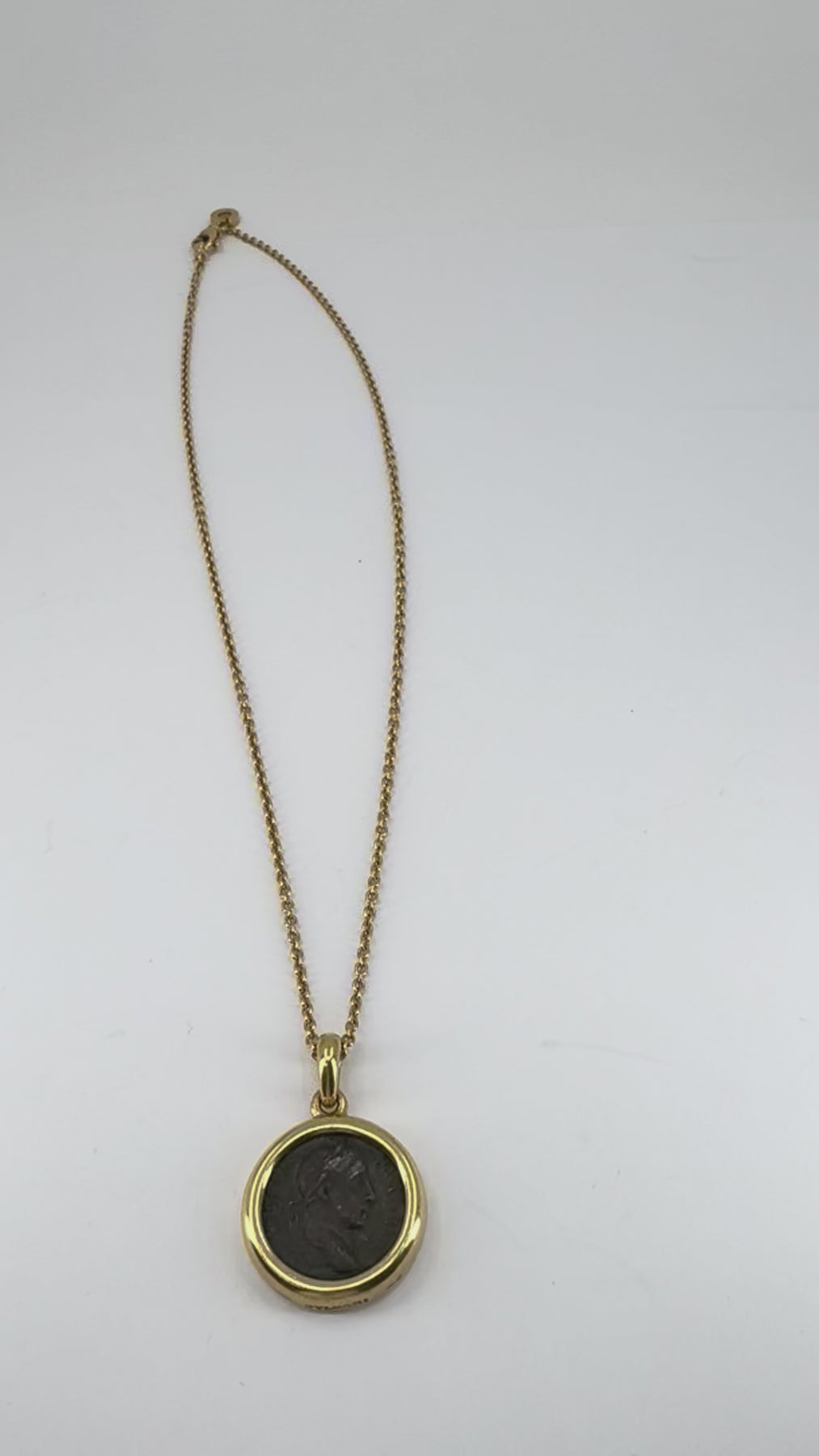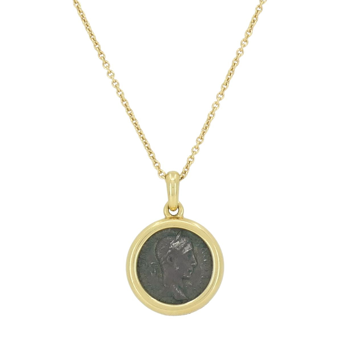 This Bulgari Monete pendant features an authentic Roman coin of Emperor Severus Alexander, A.D. 222–235, set in an 18k yellow gold bezel. The piece is crafted in the classic Bulgari style introduced in the late twentieth century, with smooth rounded edges, a generous bail, and crisp engraved lettering around the reverse identifying the coin: “ROMA – SEVERUS ALEXANDER AUG. A.D. 222–235.” The gold frame is stamped 750, the Bulgari maker’s mark, and the Italian assay mark, along with the BVLGARI signature on the side. The pendant weighs 11.73 grams and measures 1 1/4 inches in total length including the bale, with a 7/8-inch width. This is a well-preserved example of Bulgari’s iconic Monete collection, combining ancient history with refined Italian craftsmanship.