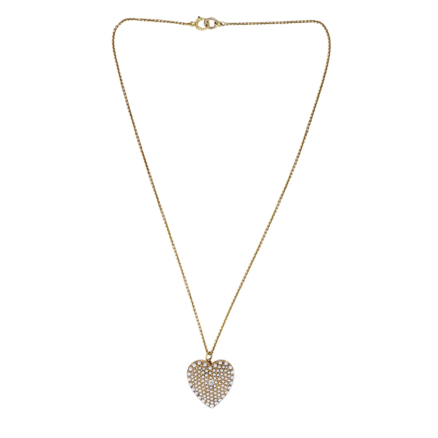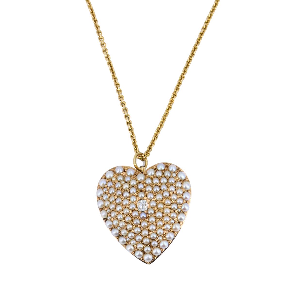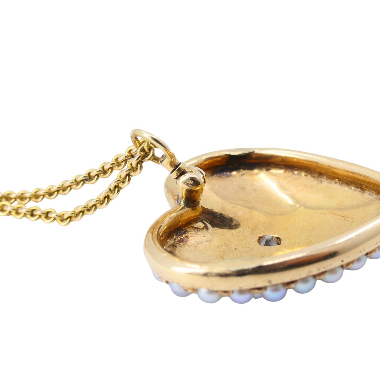 Made of 14k yellow gold, the heart is pavé-set with fine seed pearls and centered by an old mine-cut diamond, which adds a gentle sparkle to its lustrous surface. Each pearl is individually hand-set, showcasing the meticulous craftsmanship typical of the late Victorian period. The closed-back construction and softly domed form reveal the artistry of its original design, while the modification maintains its structural integrity and vintage beauty.