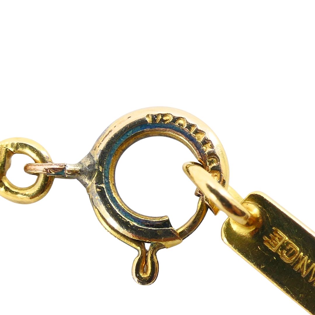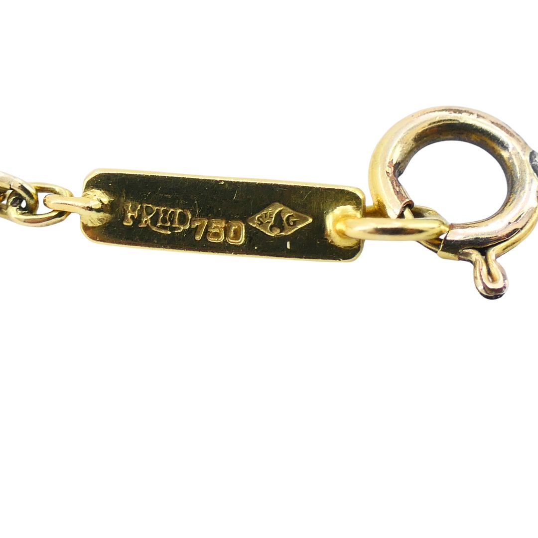 This vintage Fred Paris necklace features a pavé diamond ribbon pendant set in 18k yellow gold. The pendant measures 7/8" in length and 1/2" in height, suspended from a fine 18k gold chain measuring 19" in length. Together, the piece weighs 7.17 grams. The necklace is stamped FRED, 18kt, France, 750, maker’s mark, and serial number.
