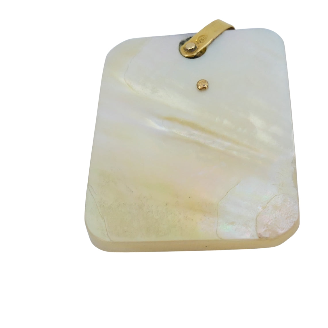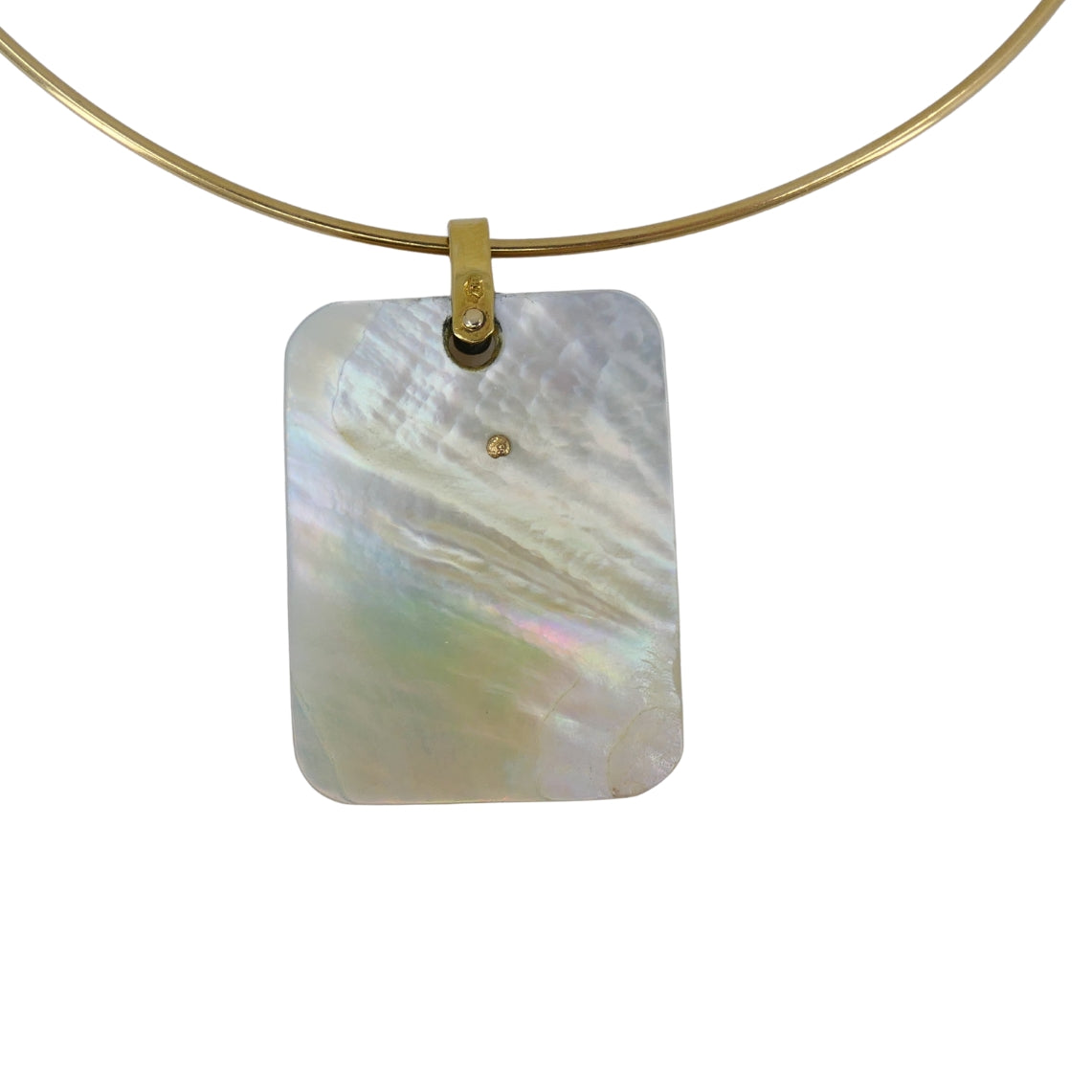 This vintage necklace is composed of two parts: a Pisces pendant and a wire collar necklace. The pendant features a rectangular piece of luminous mother of pearl with a raised 18k gold Pisces motif depicting two fish facing opposite directions. The design is detailed, with textured surfaces that emphasize the shape and movement of the fish. The mother of pearl background adds a soft, natural sheen that highlights the gold element. The pendant is attached to the 14k gold wire collar necklace.