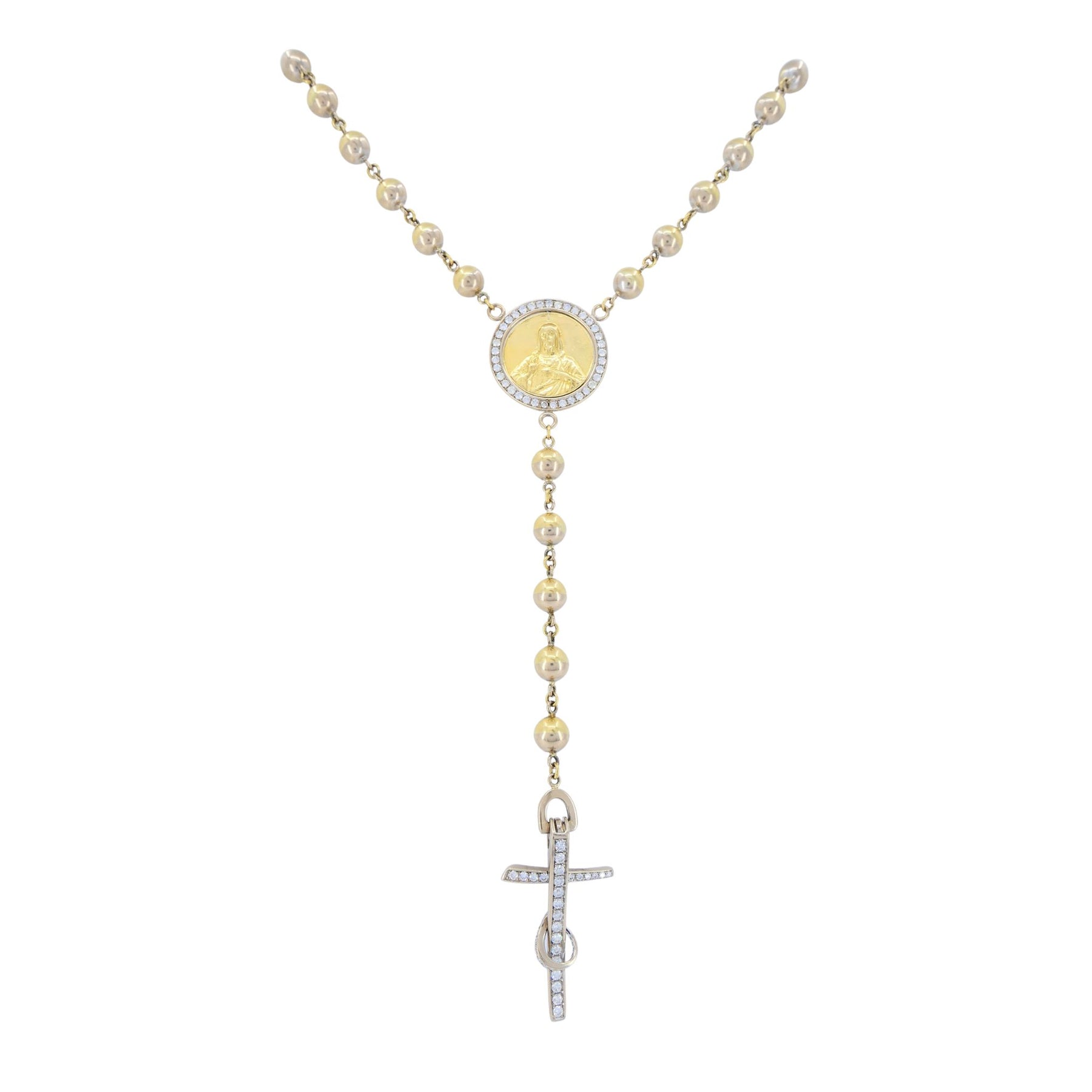 The design features a long strand of polished white and yellow gold beads leading to a central rotating medal that has Jesus on one side and flips to reveal an image of the Virgin Mary. Surrounding the medal is a frame of round brilliant diamonds set in white gold for a clean, bright finish. The drop section continues with additional beads and ends in a mechanical diamond set cross, designed with an articulated element that moves freely.