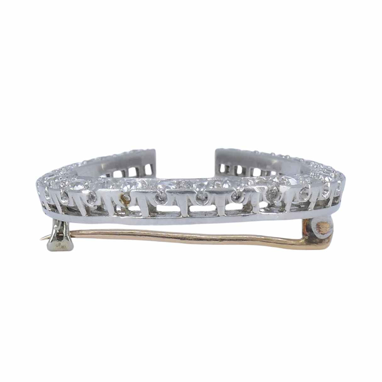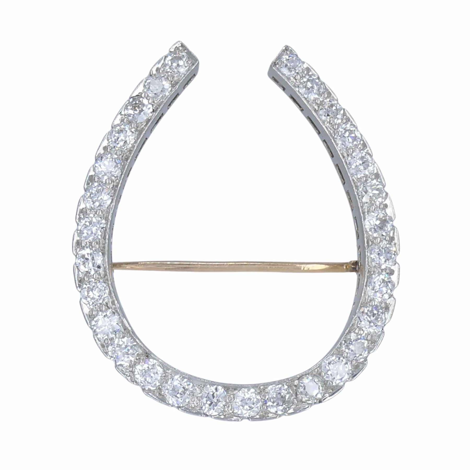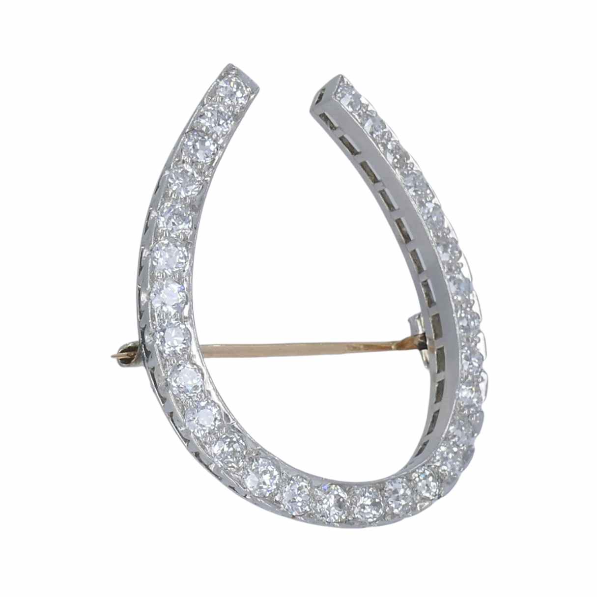 Crafted in platinum, the horseshoe brooch with diamonds is set throughout with old European-cut stones. The diamonds are bright and well matched, and the settings show careful, confident workmanship.