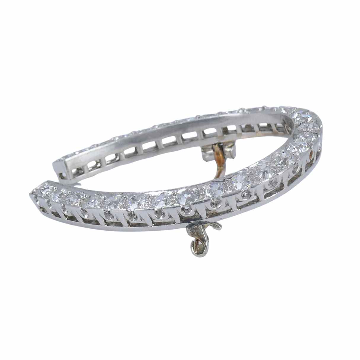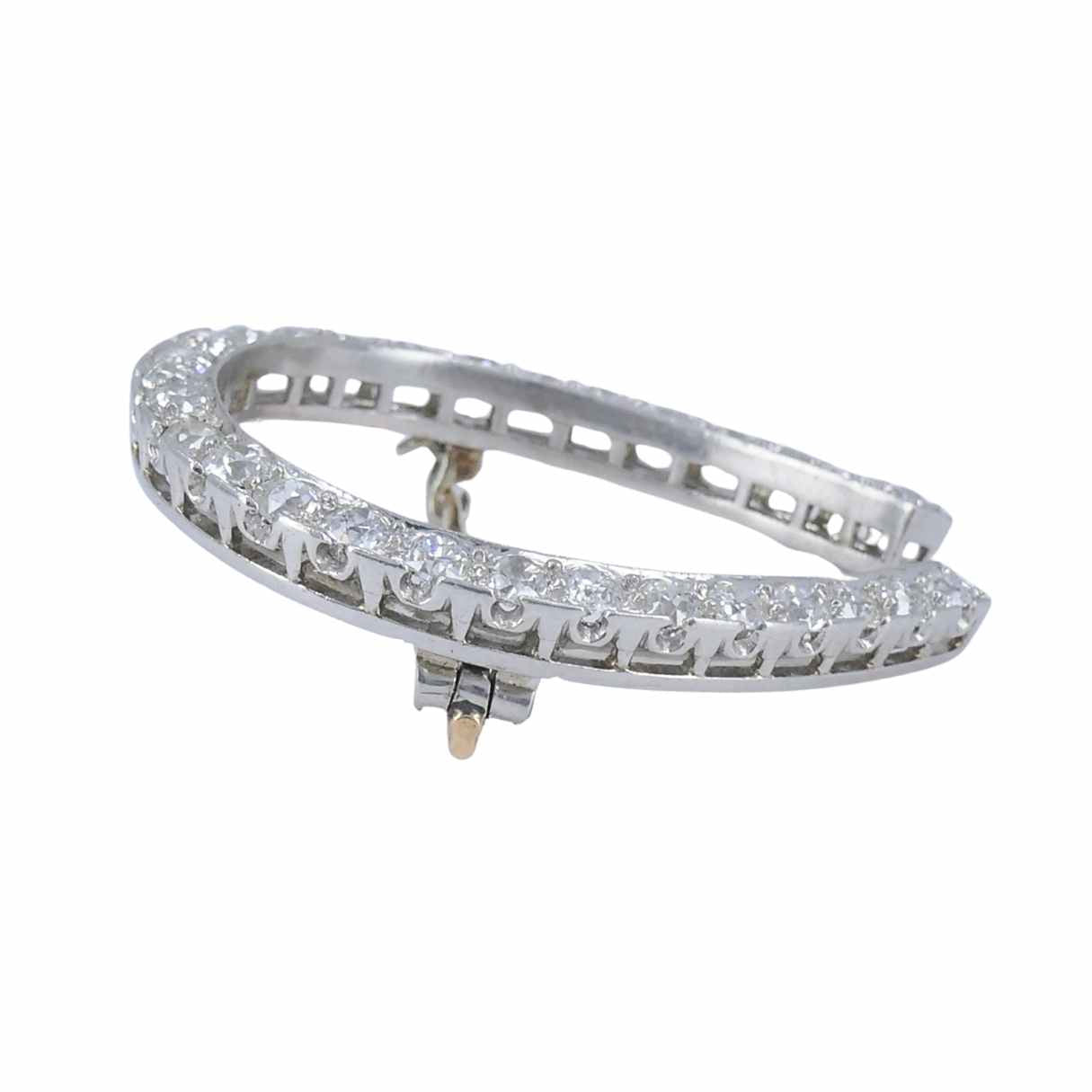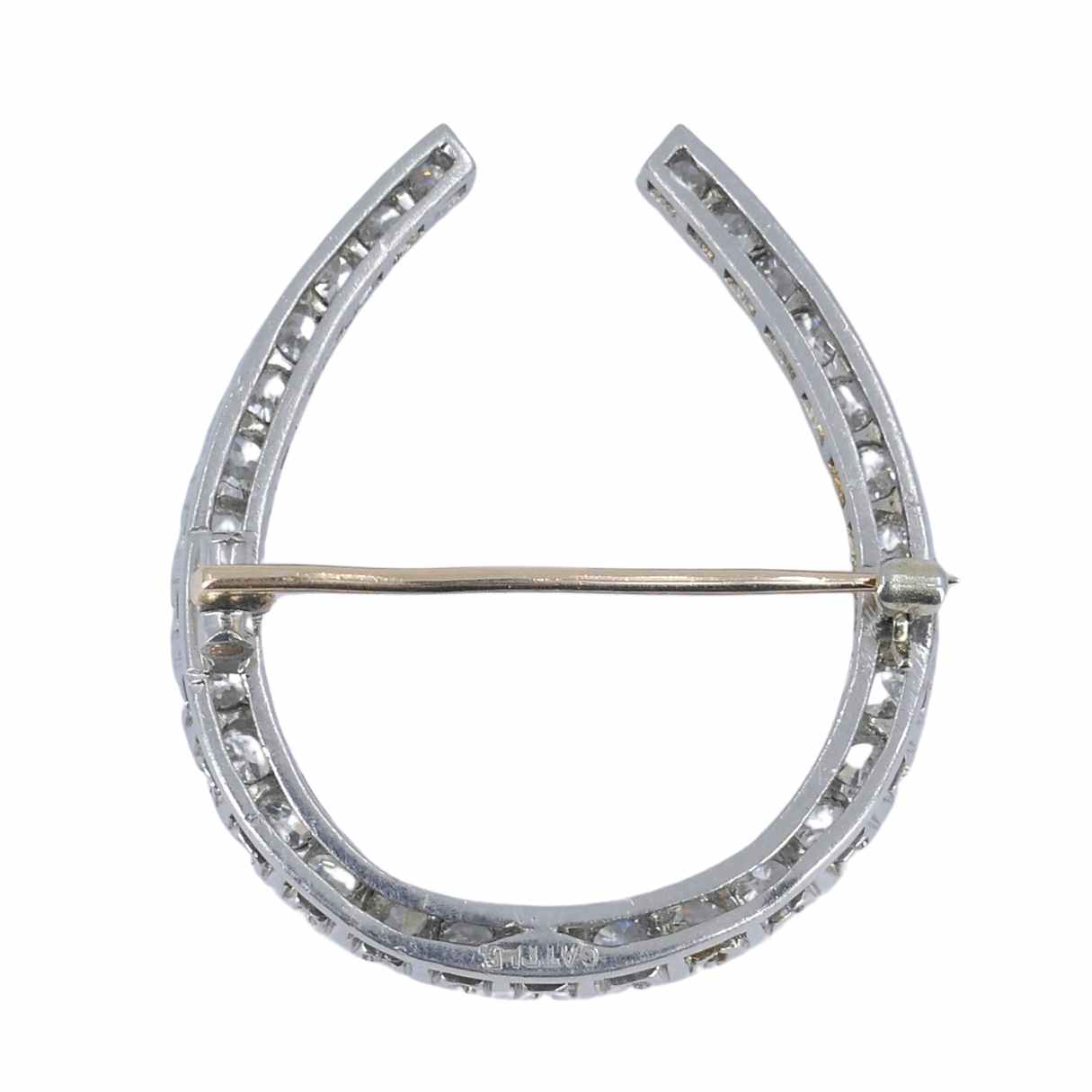Crafted in platinum, the horseshoe brooch with diamonds is set throughout with old European-cut stones. The diamonds are bright and well matched, and the settings show careful, confident workmanship.