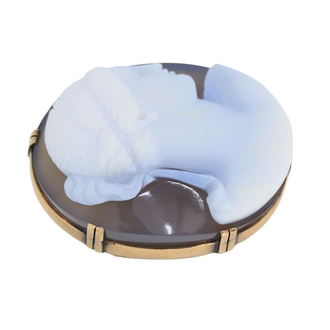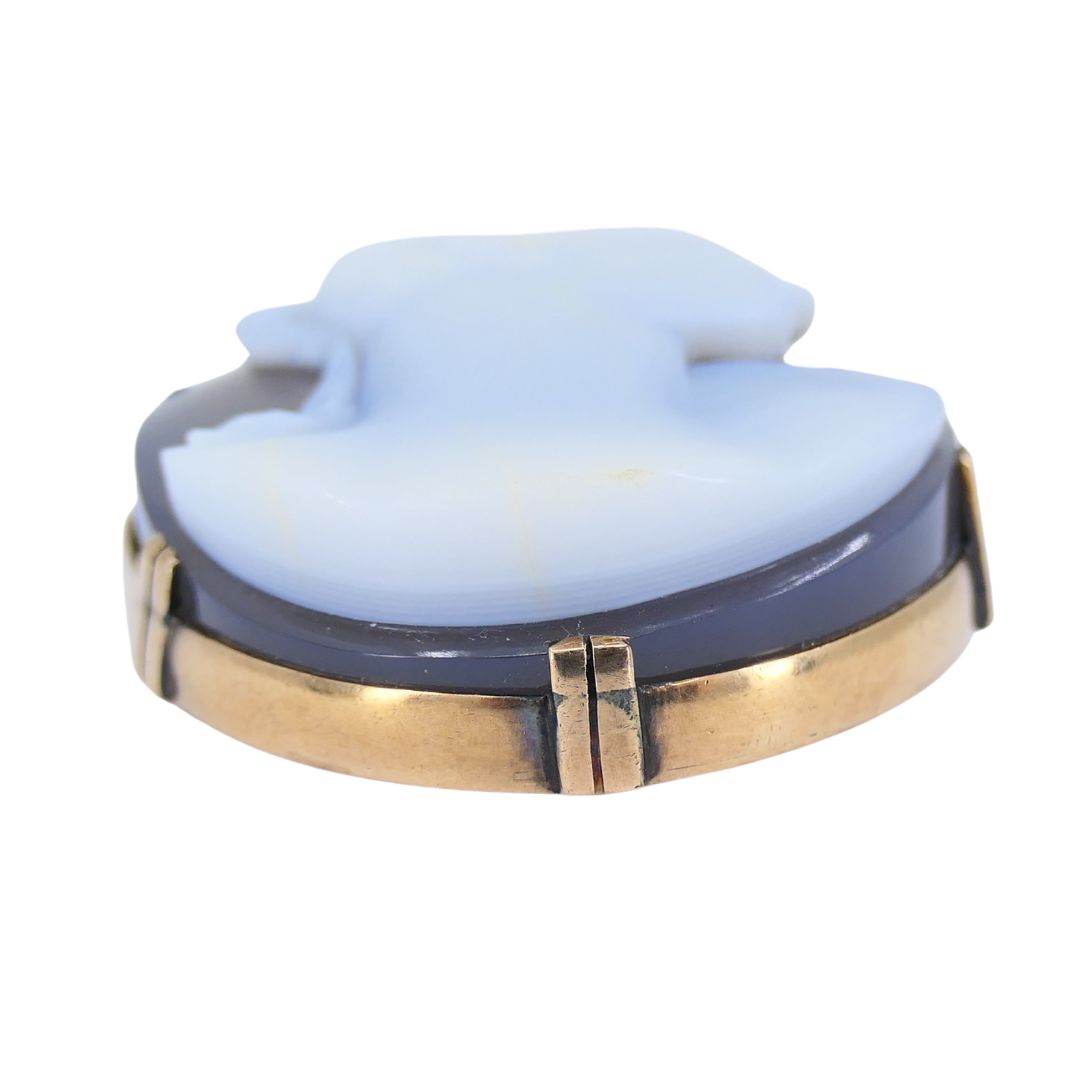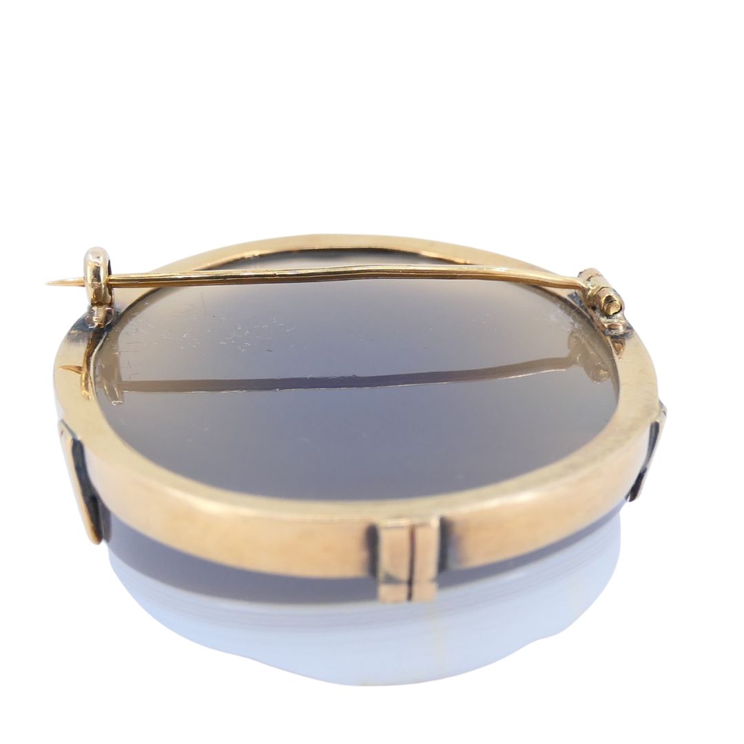 This antique cameo brooch features a finely carved hardstone portrait set in a 10K yellow gold frame. The cameo is crafted from banded agate, showcasing a soft brown background with a raised pale blue-white female profile in high relief. The carving demonstrates excellent detail in the hair and facial features, a hallmark of quality hardstone cameos from the late 19th to early 20th century.
