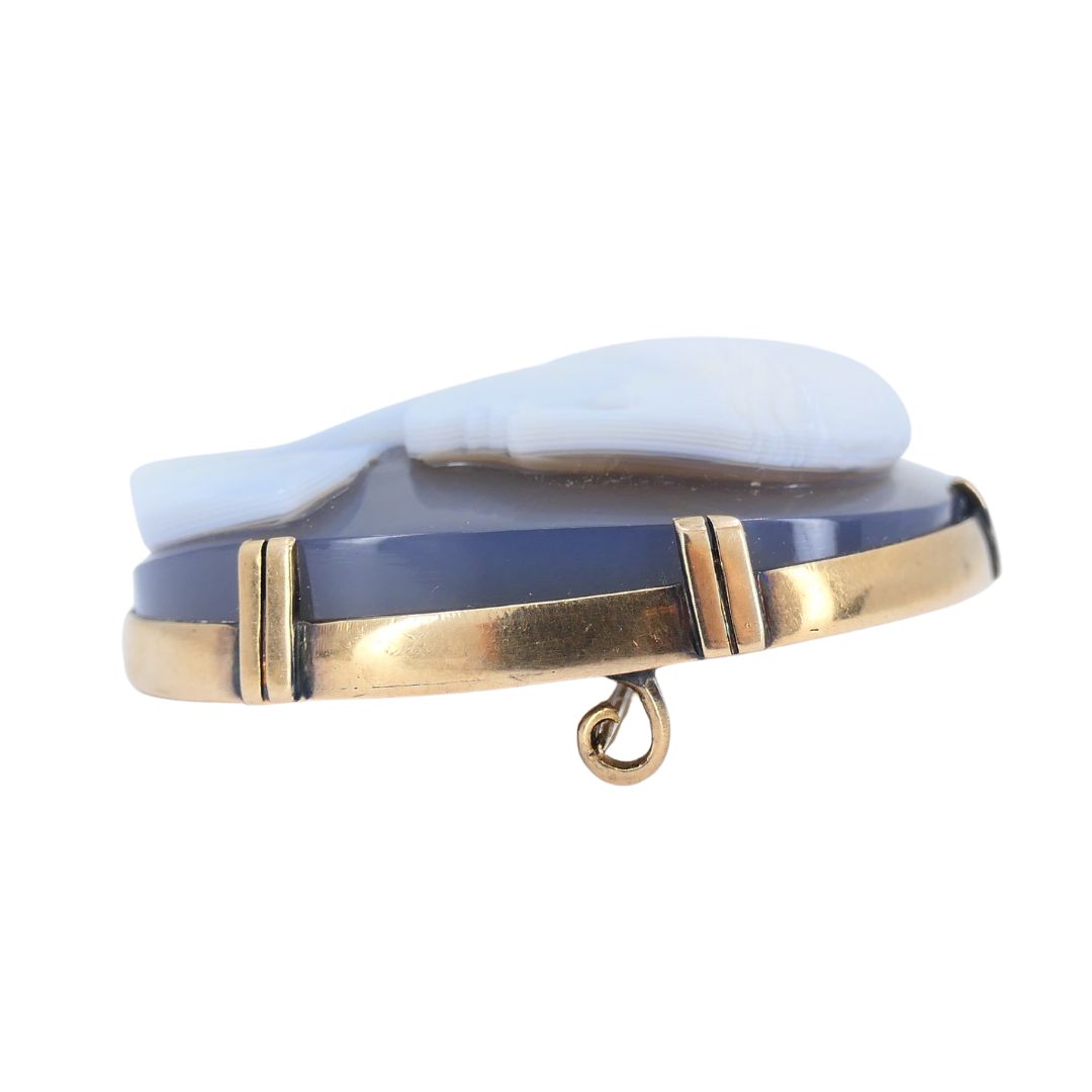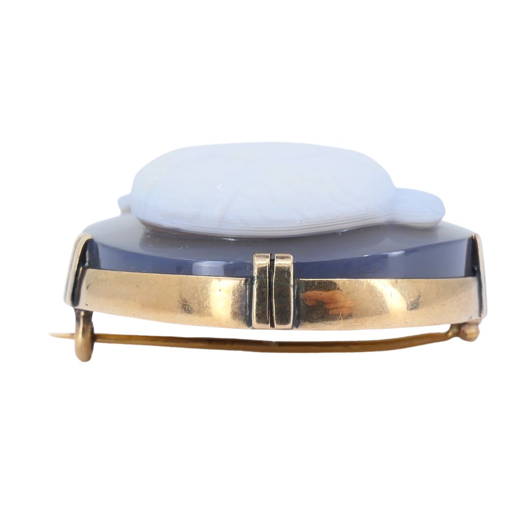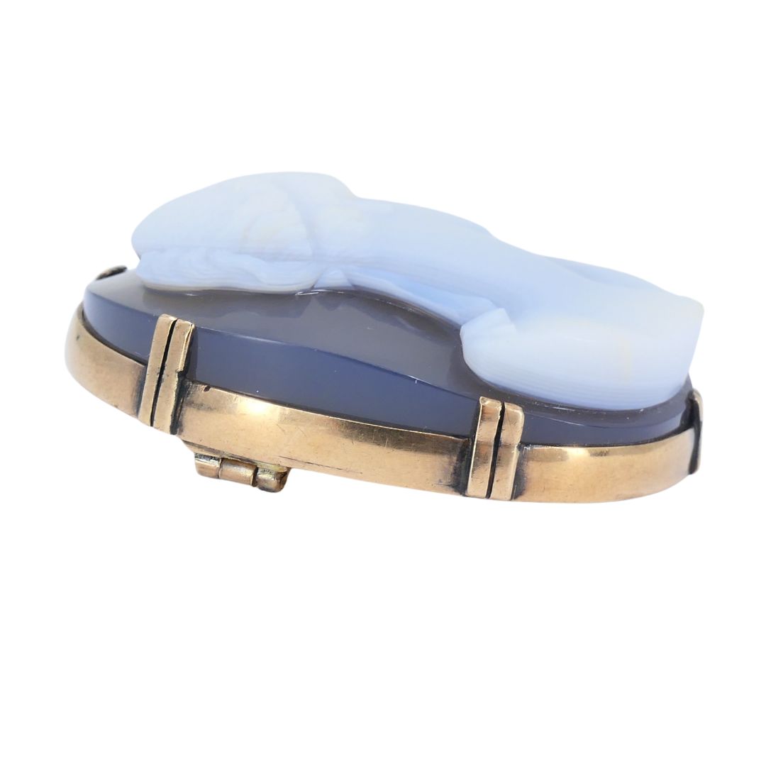 This antique cameo brooch features a finely carved hardstone portrait set in a 10K yellow gold frame. The cameo is crafted from banded agate, showcasing a soft brown background with a raised pale blue-white female profile in high relief. The carving demonstrates excellent detail in the hair and facial features, a hallmark of quality hardstone cameos from the late 19th to early 20th century.