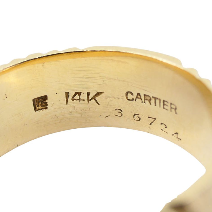This Cartier ring from the 1950s is crafted in 14k gold and weighs 8 grams. It features a brushed gold design with an engraved pattern of intersecting lines wrapping around the band. The texture creates contrast between the polished and matte finishes, adding depth to the design. The ring has a band width of 1/4 inch and is a size 7, with no option for resizing due to its solid construction. Stamped with "14k," "Cartier," a serial number, and a maker’s mark, the engraving confirms its authenticity and craftsmanship. This piece reflects Cartier’s mid-century approach to elegant yet understated jewelry, making it a classic addition to any collection.