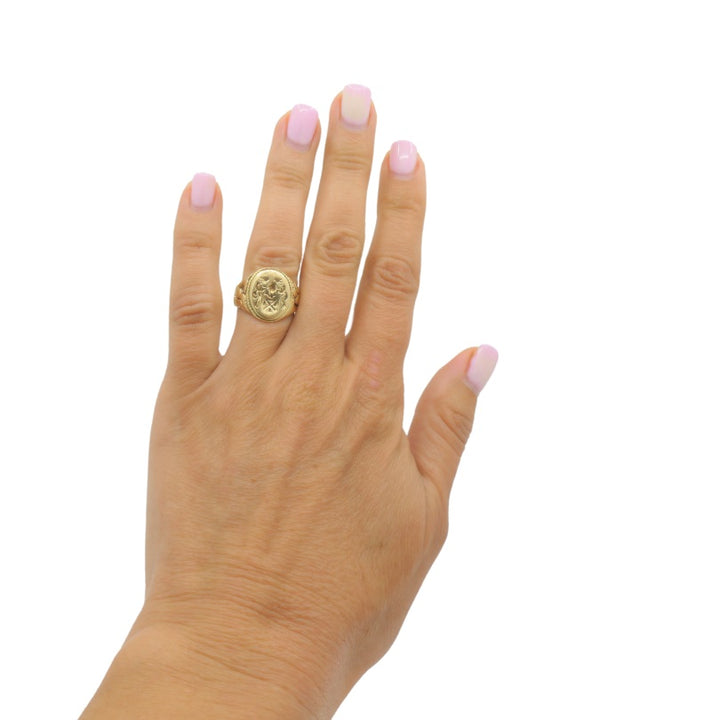 An antique 14k gold signet ring with a family crest design.