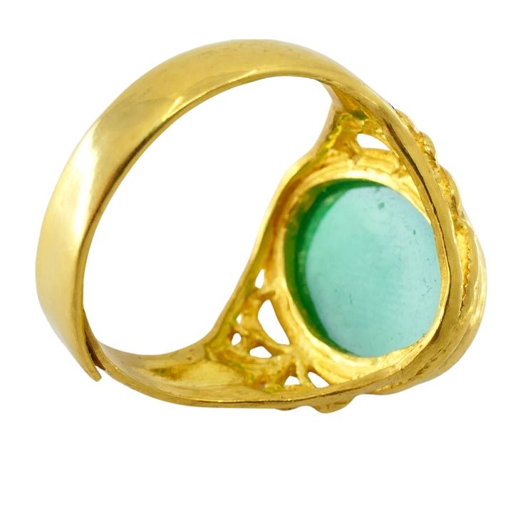 The cabochon jade set in a delicate open-work mounting, adorned with intricate filigree style cutouts on either side. A subtle migraine detail frames the bezel, adding a sense of lightness to the design.