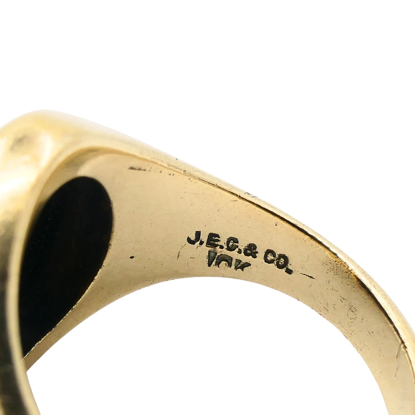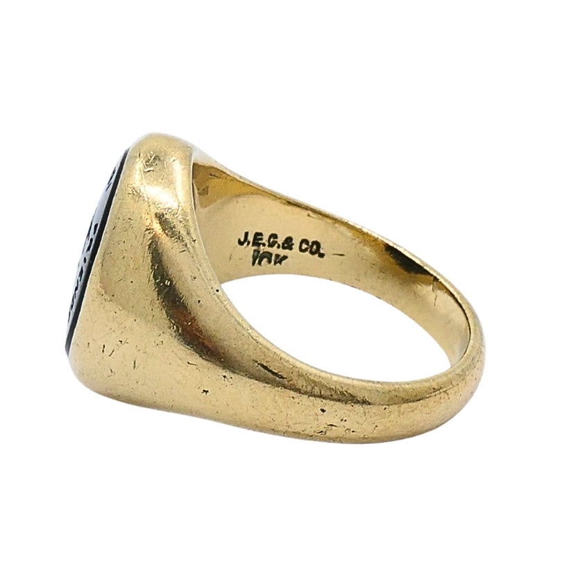This circa 1900s signet ring is crafted in 10k gold and set with a carved carnelian. The stone is engraved with the words "Friends' Central School 1845," along with the school’s emblem. The engraving is clear and neatly detailed, standing out against the deep tone of the carnelian. It’s a classic school ring that is traditionally given to high school or college students. With its combination of gold and carved gemstone, this ring carries heritage and great aesthetic.