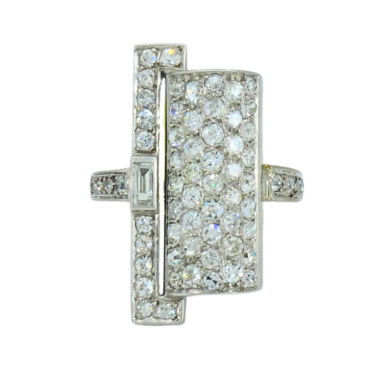 A spectacular French Art Deco diamond ring made of platinum and 18k white gold.