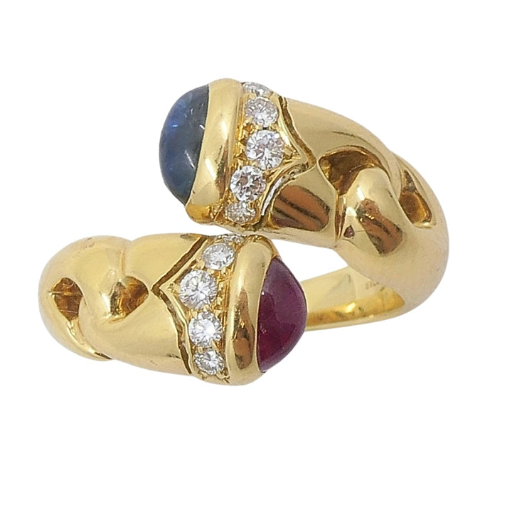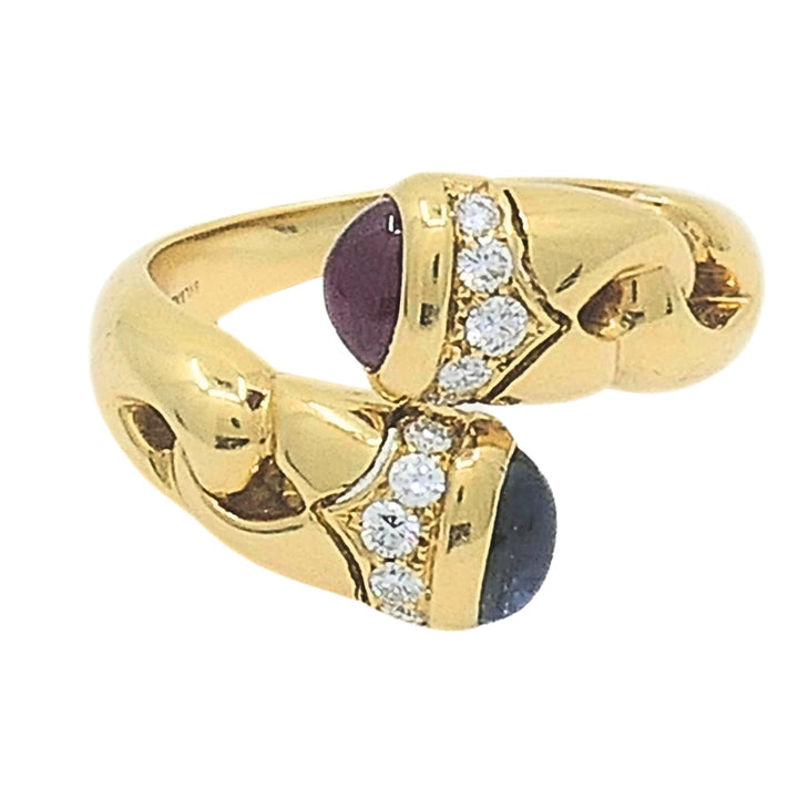 An iconic Bulgari Doppio Cuore bypass ring features diamonds and colored