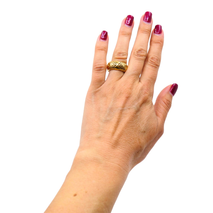 The Bulgari Parentesi ring in 18k yellow gold is an iconic piece from the Parentesi collection, introduced in the early 1980s. Inspired by the travertine joints of Rome's ancient stone pavements, the design features interlocking geometric shapes that create a modular and flexible structure. This timeless motif reflects Bulgari's innovative approach to jewelry, combining historical inspiration with modern elegance. The Parentesi ring is celebrated for its versatility, making it suitable for both daytime and evening wear, embodying the sophistication and heritage of Roman craftsmanship.