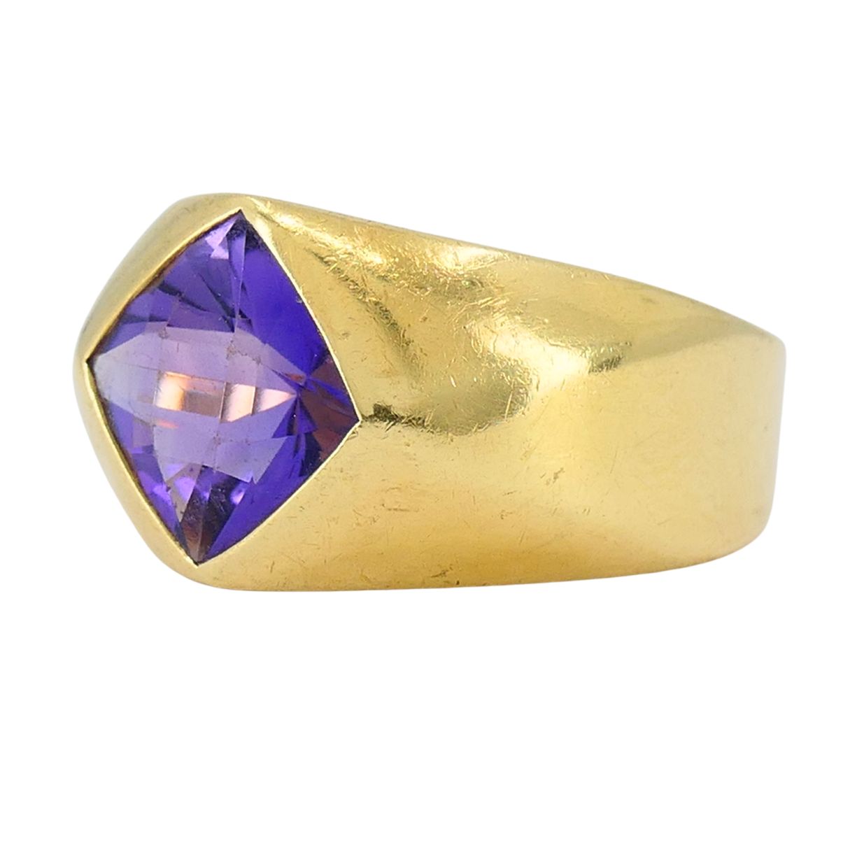 This elegant vintage French ring embodies the bold minimalism and sculptural precision that defined late-20th-century European design. Crafted in 18K yellow gold, it features a vivid crisscut (cross-cut) amethyst, expertly set flush within a wide, softly contoured bezel. The gemstone’s distinctive faceting forms a four-pointed star at its center, reflecting light with remarkable depth and symmetry.