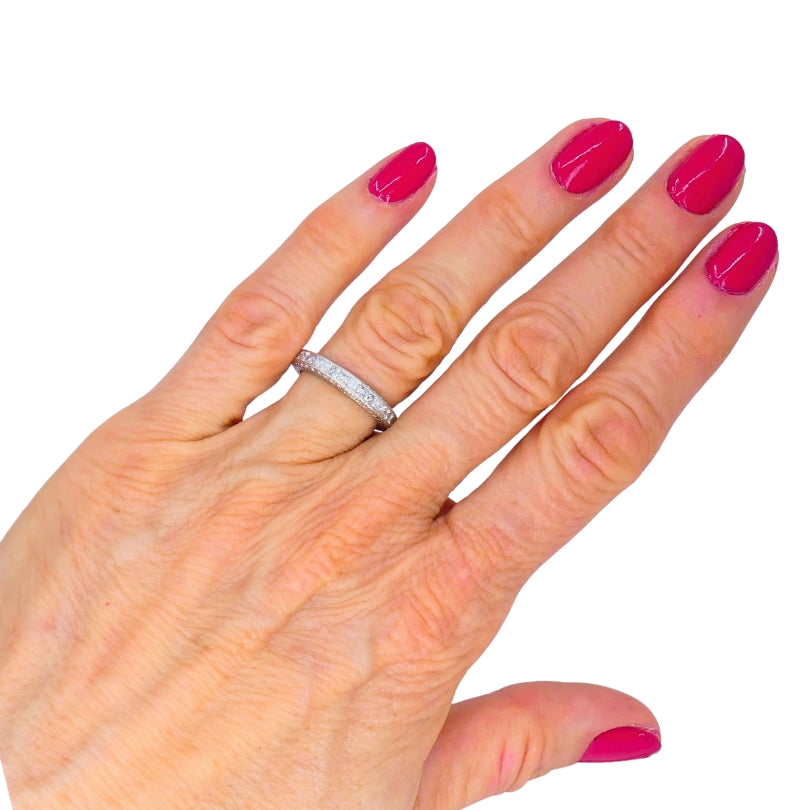 This platinum eternity band by Michael Beaudry is set with a continuous row of princess cut diamonds. The square shape of the diamonds aligned closely forms a seamless line while the channel setting creates a smooth edge. On the outer edge of the band, a leafy engraved pattern adds character and detail. This organic design contrasts the geometric nature of the princess cut diamonds. Eternity bands are valued not only for their design but also for their meaning. With diamonds encircling the entire band, they symbolize everlasting love and commitment. The continuous pattern of stones is a symbol of love that goes on forever, which is why eternity bands feel so meaningful as well as stylish. We also carry an identical Michael Beaudry eternity ring in size 6.5-6.75 that pairs perfectly with this band (pictures of both bands together provided).