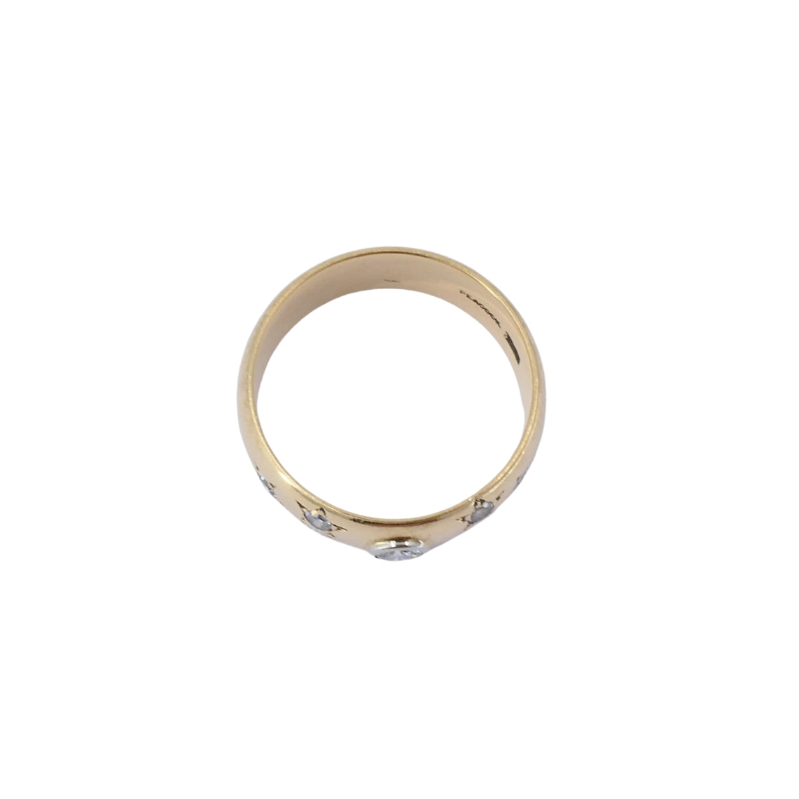 The band is made of polished yellow gold and features a symmetrical diamond arrangement. At the center sits a 0.17-carat round-cut diamond set in a smooth bezel. Surrounding it are six single-cut diamonds totaling 0.28 carats, each set flush into the gold for a modern finish.