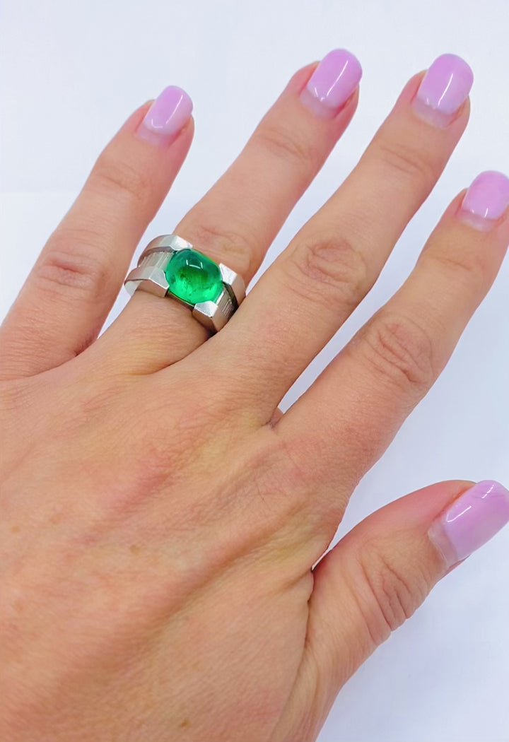 The ring has a strong, structured design with the band features a stepped setting that secures a cabochon emerald. Flanking the emerald, channel set baguette diamonds run along the sides of the band. The way the platinum holds the emerald gives the ring a solid sculptural quality. This emerald ring, with its great structured feel, looks both bold and very chic.
