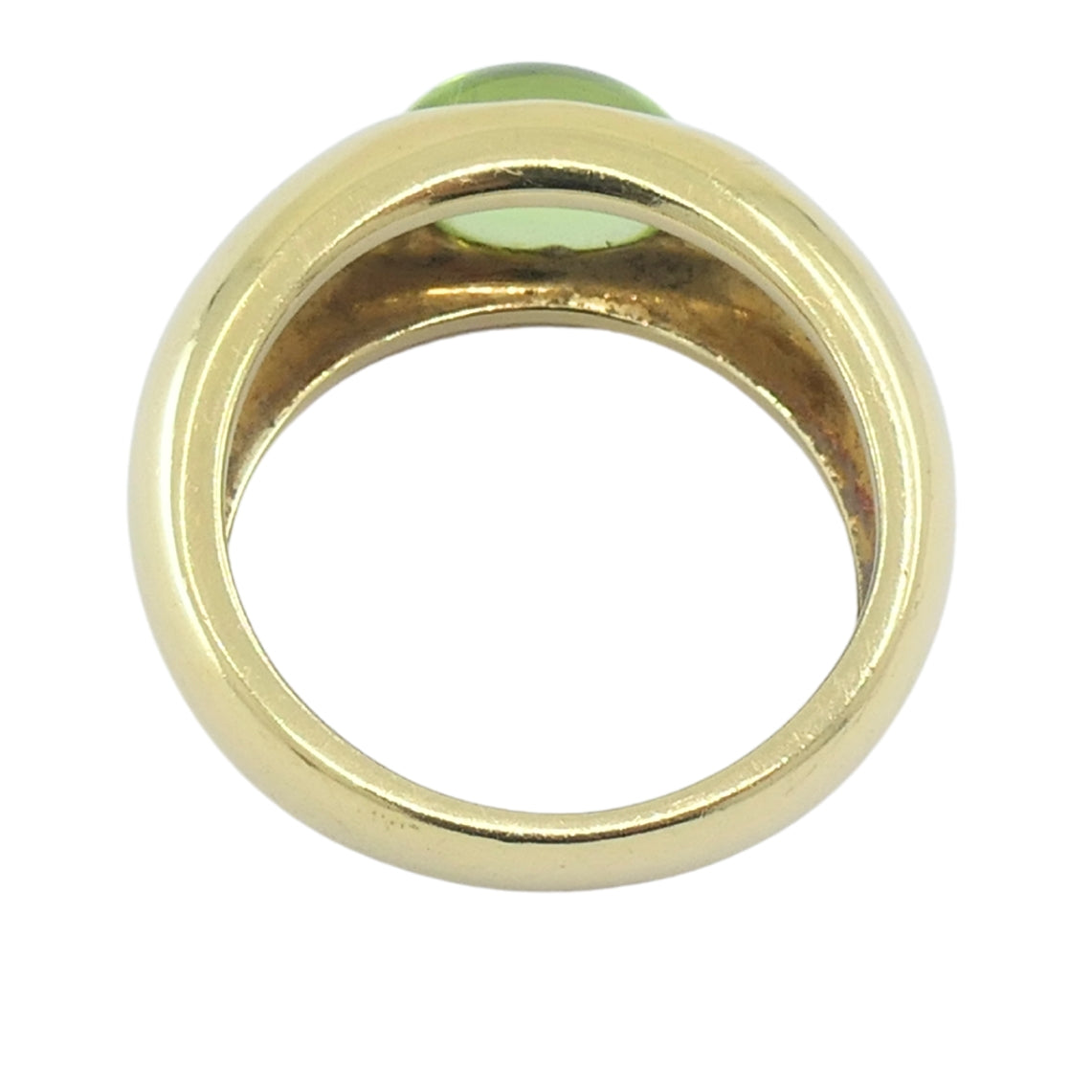 A Tiffany & Co. ring, made of 18k gold and features a smooth cabochon peridot set directly into the band. The ring has a rounded profile with a polished finish. The peridot shows a soft green tone with natural transparency. Its cabochon cut keeps the look clean and understated, in line with Tiffany’s modern gold designs.