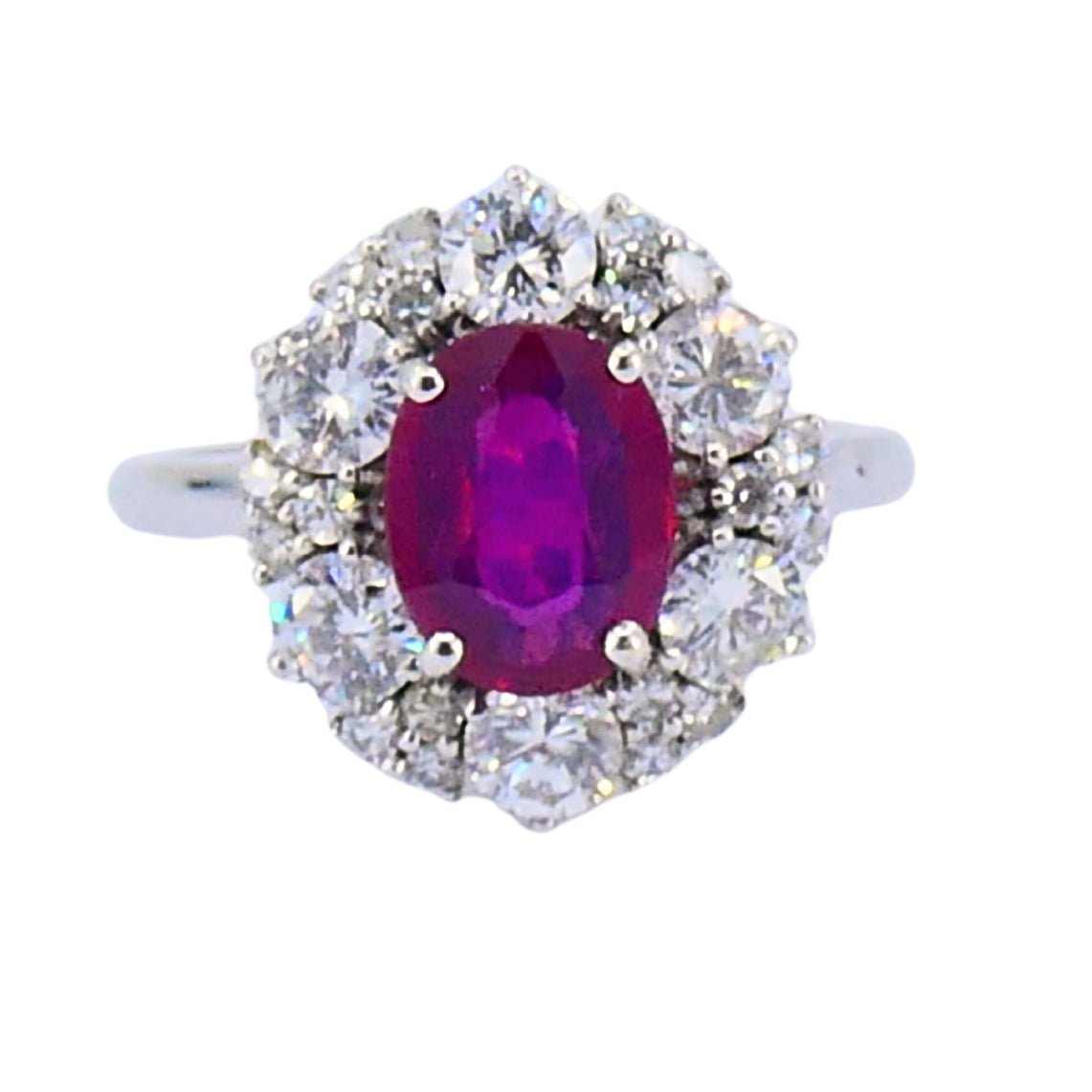 This vintage 18k white gold cluster ring showcases a vivid 1.75-carat natural ruby of Burma origin. The oval-cut ruby is framed by a halo of bright, round-cut diamonds. With its balanced proportions and classic halo arrangement, this vintage ruby and diamond ring is a refined statement piece. It’s a great choice for someone who wants an engagement ring that stands apart from the traditional diamond.