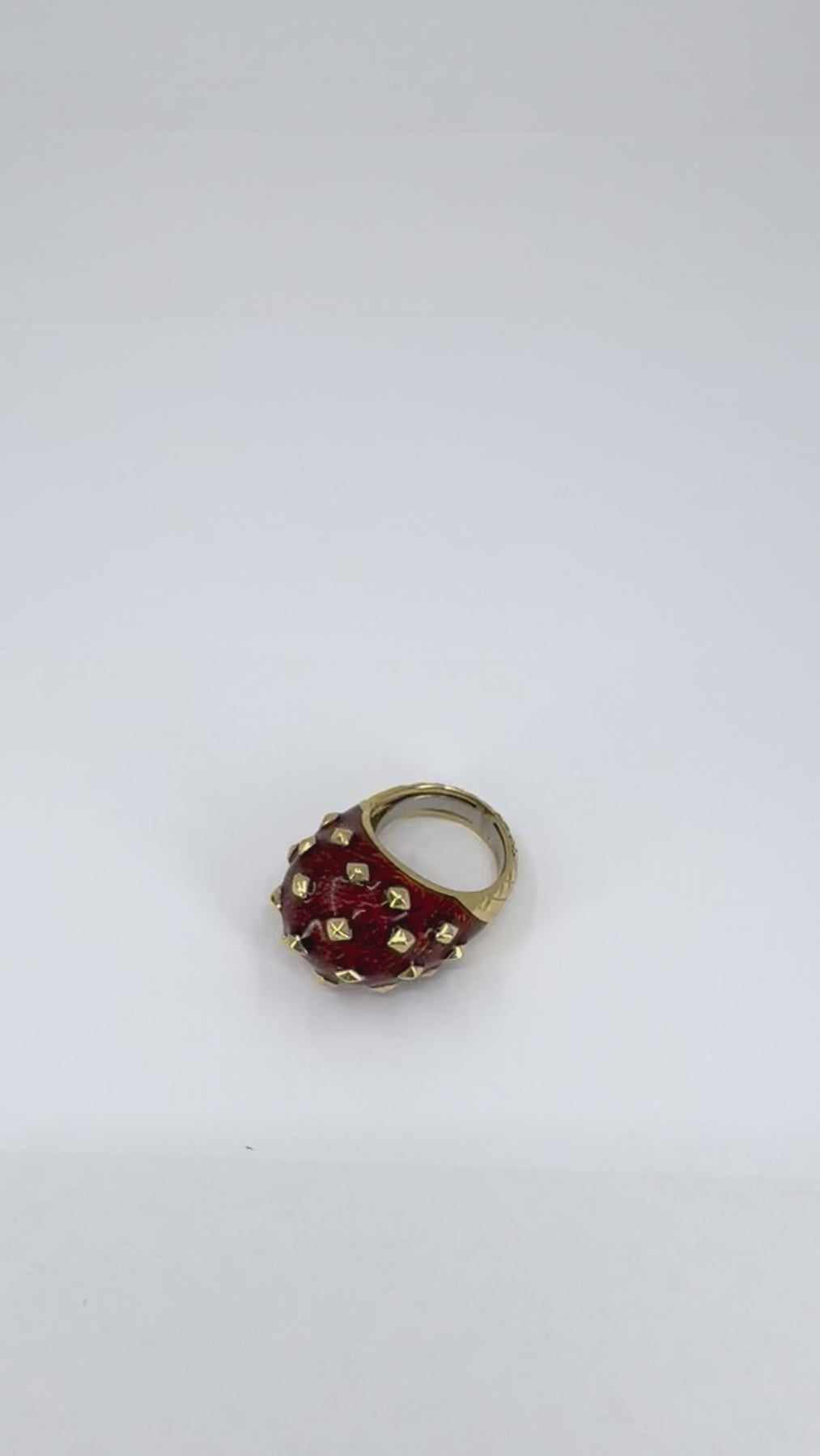 This vintage David Webb ring is crafted in 18k yellow gold with a striking red guilloché enamel dome accented by raised gold studs. The bold design showcases Webb’s distinctive style, combining vibrant enamel with sculptural gold elements. The dome measures 5/8" in height and 1/2" in width, creating a strong presence on the hand. The ring is fitted with an inner shank, allowing it to comfortably fit sizes 7.5 to 8.5. Total weight is 21.6 grams.