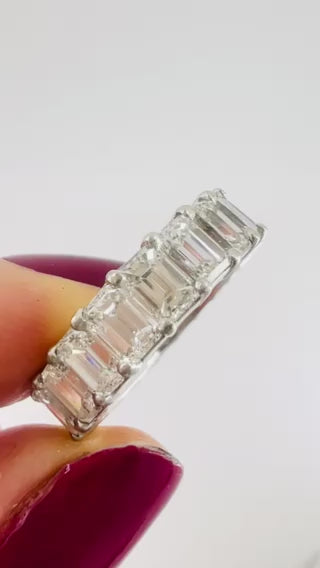 Crafted from polished platinum, the band is set with a continuous row of baguette cut diamonds. Each diamond is cut to showcase its clarity. The baguette cut adds a sleek, geometric look that stands out from more traditional round cut diamond rings.