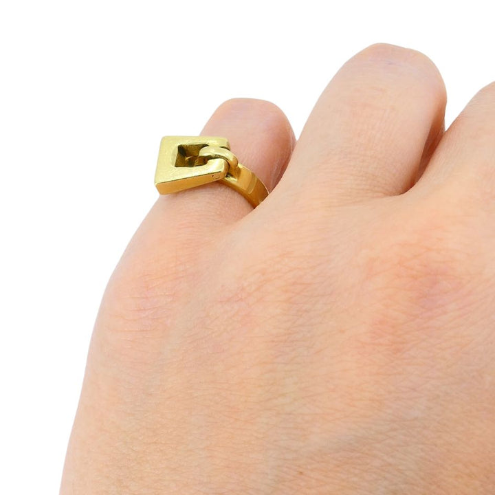 This 18k gold ring by Tiffany & Co., circa 1970s. The padlock-inspired design incorporates a functional hinge, allowing movement in the central element. This kinetic feature adds both visual interest and a tactile experience. Weighing 9.2 grams, the ring has a width of 3/8" and is stamped with "18k" and "Tiffany," confirming its authenticity. Designed in a size 5.5, it can be resized if needed. The band is solid and well-proportioned, providing a comfortable fit. As a vintage piece, it shows some wear consistent with age, contributing to its character. This ring reflects Tiffany & Co.’s legacy of innovative, high-quality craftsmanship in fine jewelry design.