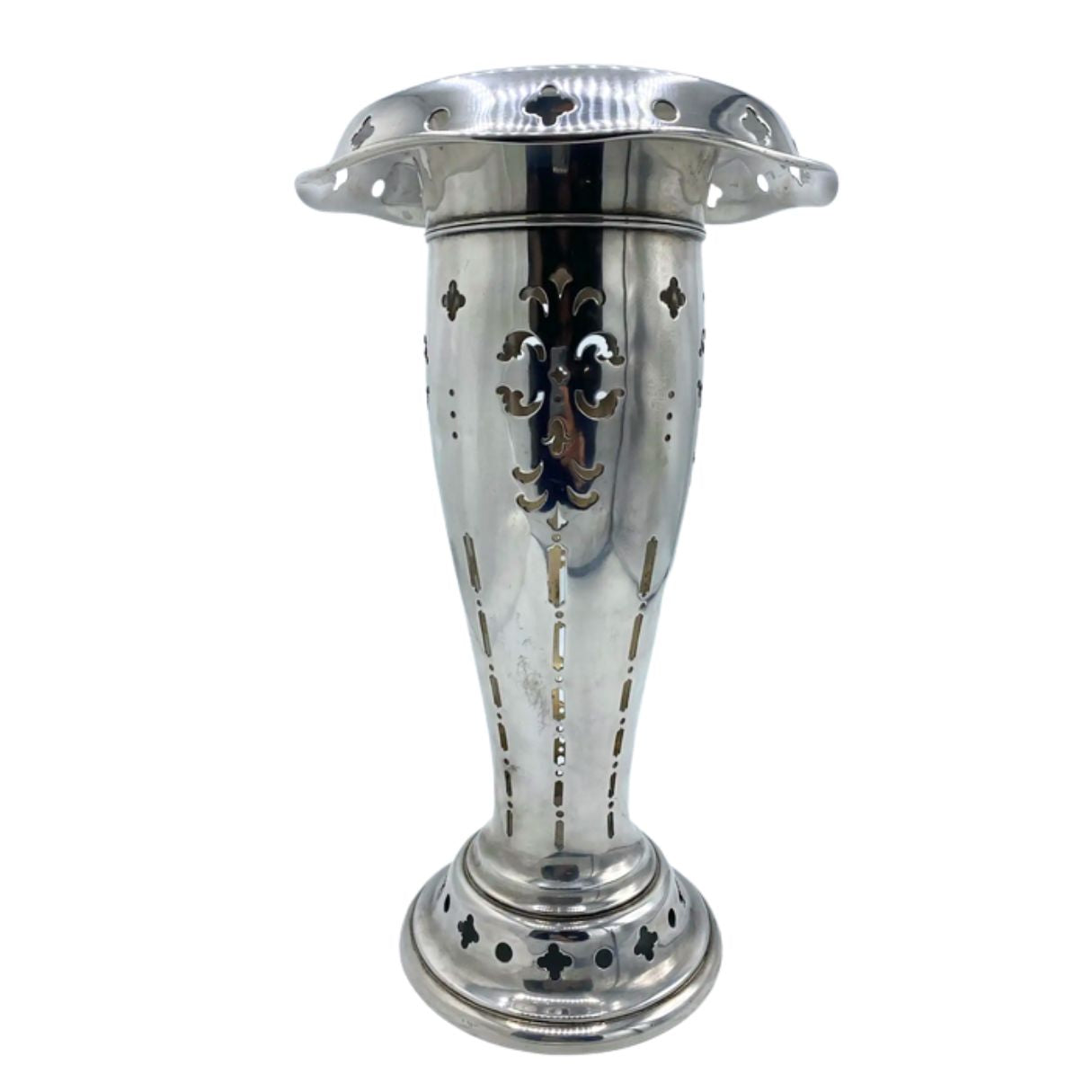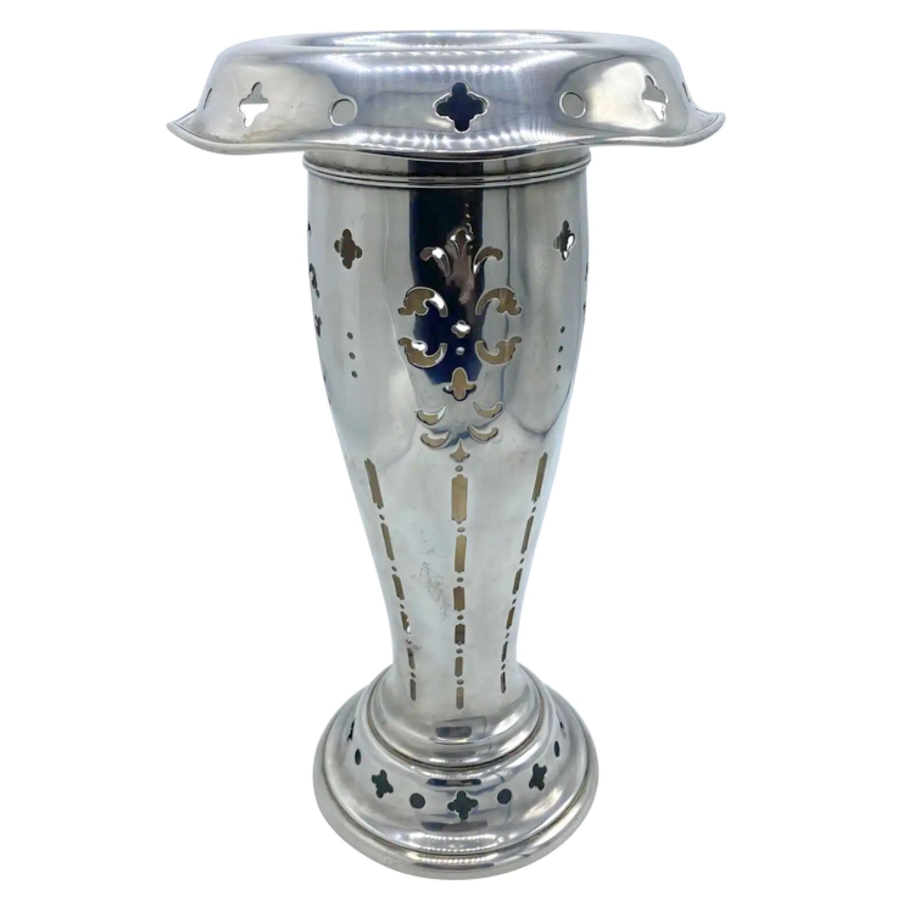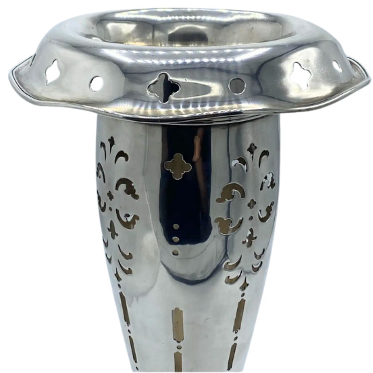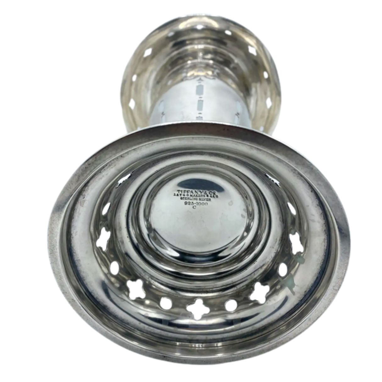 The vase is created by Tiffany & Co., it is made out of 925/ 1000 sterling silver. The vase features floral and geometric cut outs design. It comes without liner.