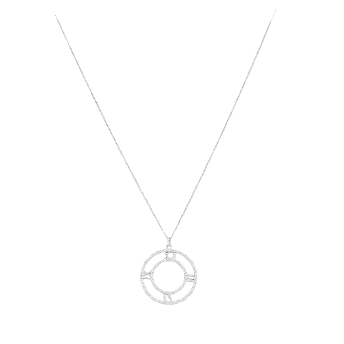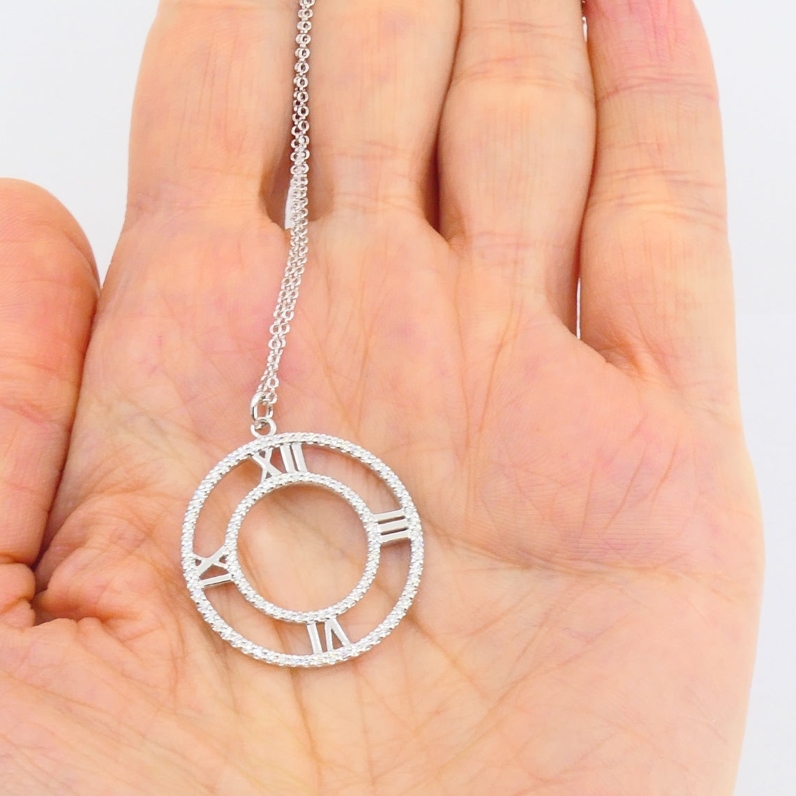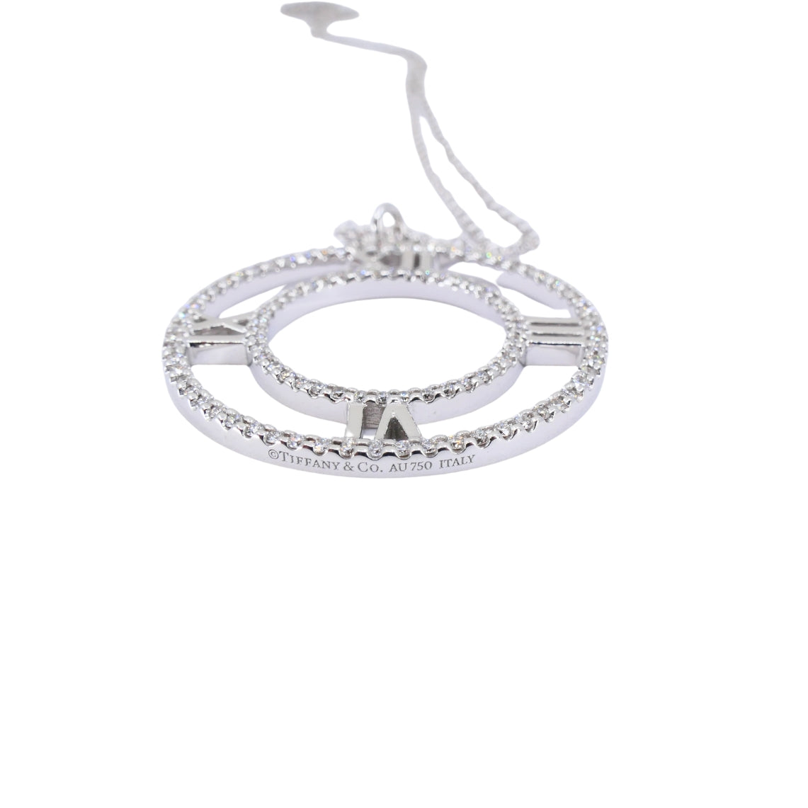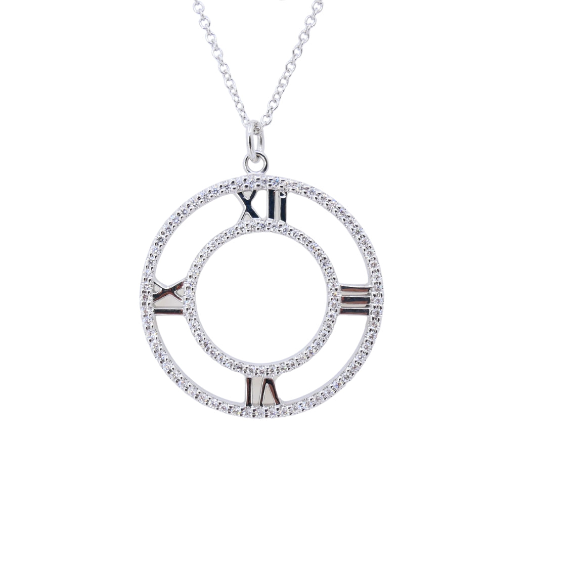 This Tiffany & Co. Atlas open pendant necklace is crafted in 18k white gold and set with round brilliant-cut diamonds. The design is inspired by the Roman numerals that adorn the iconic Atlas clock above the Tiffany flagship store in New York. The open circle pendant features polished gold numerals at the cardinal points, framed by pavé-set diamonds. The geometric structure gives the pendant a clean look that feels both modern and classic.