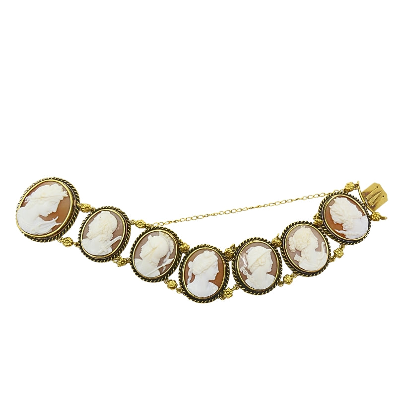 Elegant antique 14k gold bracelet featuring seven cameos, each depicting a classical profile. The cameos are oval-shaped and bezel set within finely crafted rope-twist gold frames accented by small floral connectors. The central cameo measures approximately 5/8 inch by 15/16 inch, with the bracelet’s total length measuring 7 1/2 inches.