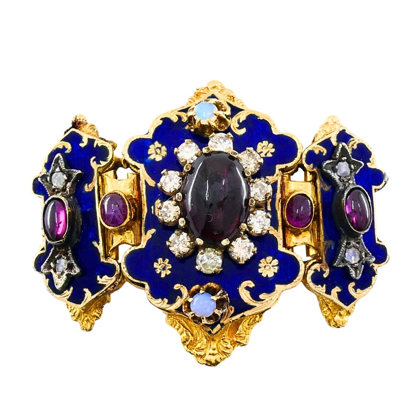 A striking antique buckle form jewel crafted in 14k gold, highlighted with deep blue enamel and set with a stunning array of gemstones. At its center rests an oval cabochon garnet, haloed by diamonds, while additional cabochon garnets and opal accents enrich the intricate design. The ornate goldwork and enamel detailing evoke the grandeur of the Victorian period, making this piece both a decorative buckle element and a potential pendant. A distinctive collector’s piece that beautifully blends color, craftsmanship, and versatility.