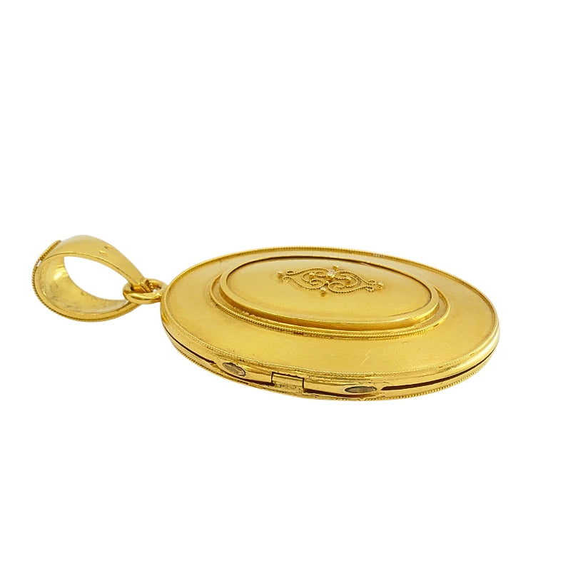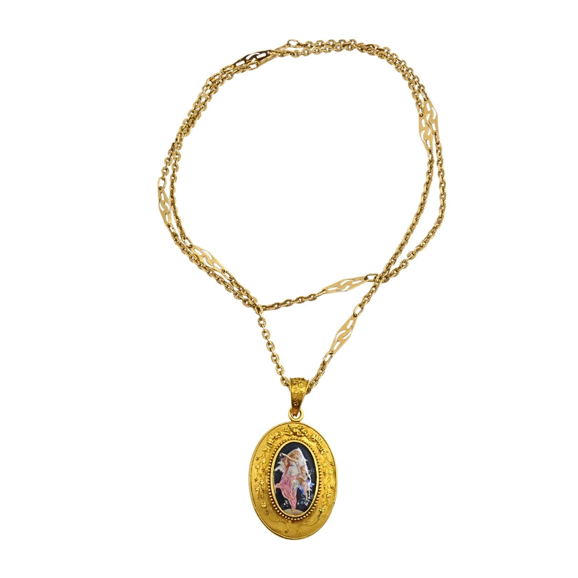This exquisite Victorian-era necklace features an oval locket pendant crafted in 18 karat gold. The front showcases a finely painted enamel miniature depicting an angelic scene, framed within a detailed repoussé border of scrolling foliate motifs. The locket opens to reveal space for cherished keepsakes or portraits.