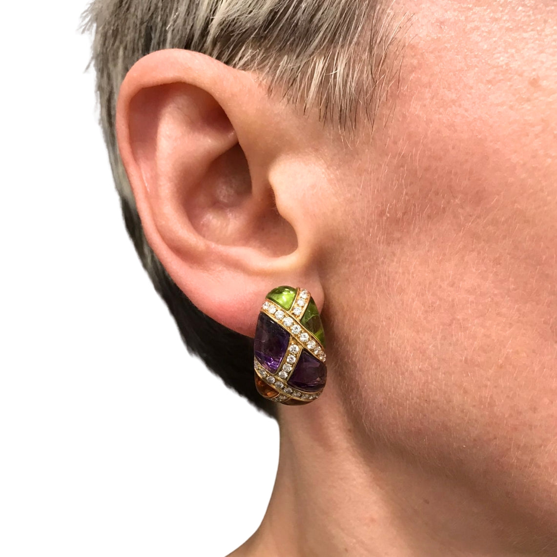 These Bulgari earrings are crafted in 18k gold and showcase the house’s bold approach to color and form. Each earring is designed as a sculptural, softly rounded shape, set with polished cabochon gemstones in rich shades of purple, golden yellow, and green. Amethyst, citrine, and peridot are arranged in a geometric pattern, framed by gold bands set with round brilliant diamonds. The diamonds beautifully highlight the curves of the gems.