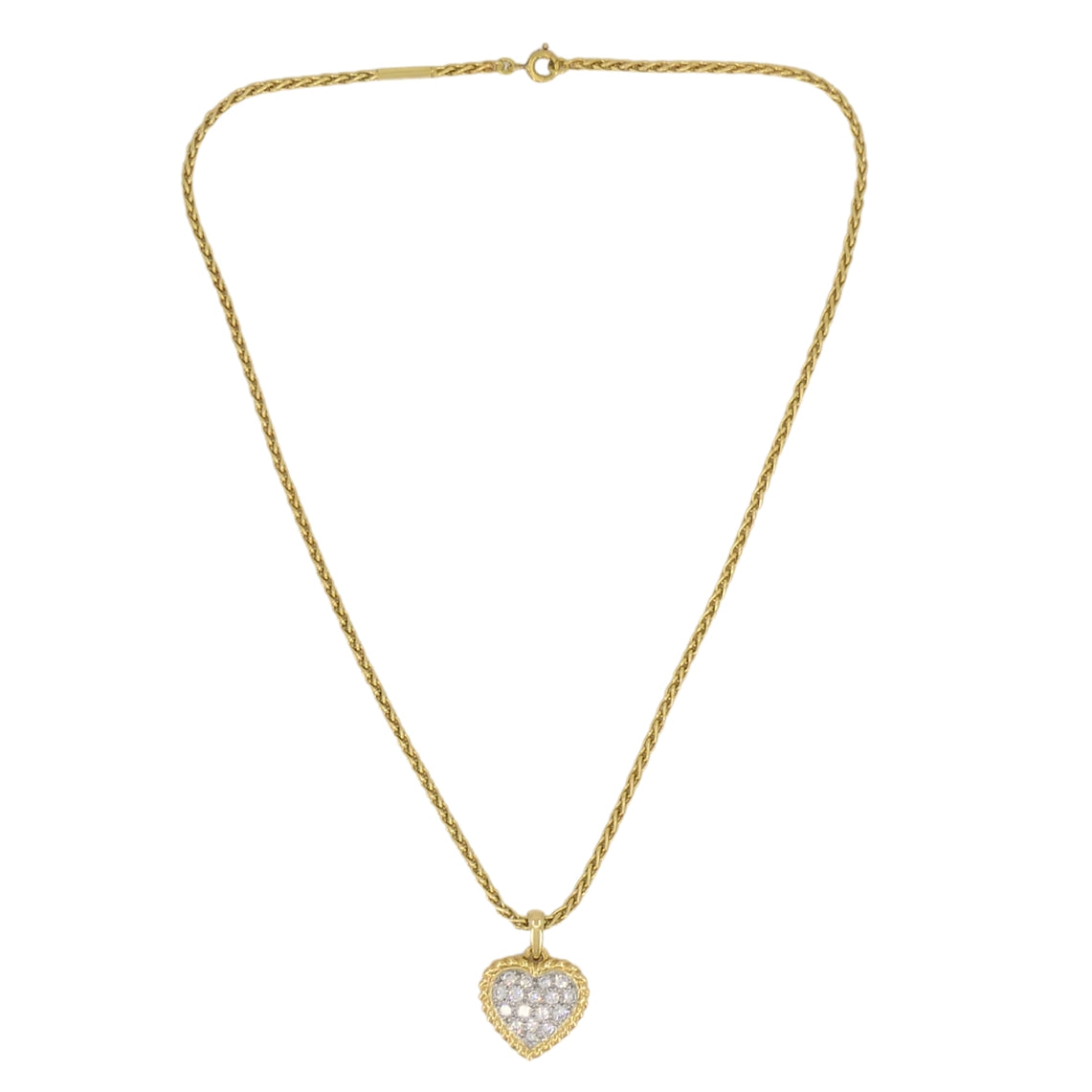 This Van Cleef & Arpels diamond heart pendant necklace is a refined example of the Maison’s iconic style. The heart-shaped pendant is crafted in platinum, set with closely arranged diamonds, and framed by a rope-twist 18k gold edge. There are 17 large diamonds in a pave setting that are white round gems D-E-F in color, with total carat weight of a little over 1 carat.