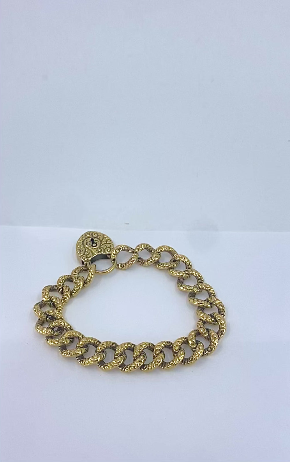 This beautifully crafted 14k gold bracelet features ornate engraving throughout its curb links and heart-shaped padlock clasp. Weighing approximately 12 grams, the piece exudes timeless elegance with its intricate scrollwork. The heart lock functions as both a secure and decorative closure, adding a touch of romantic charm. A striking statement on its own or paired with other gold favorites, this bracelet captures the refined artistry of antique-inspired design and exceptional craftsmanship.