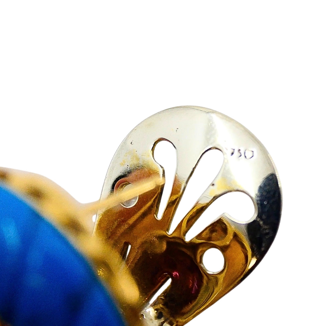 These earrings combine vibrant color with sculptural detail. Each earring is crafted in 18k gold and set with carved turquoise shaped into a rounded button form. The turquoise features ribbed carving across the surface.