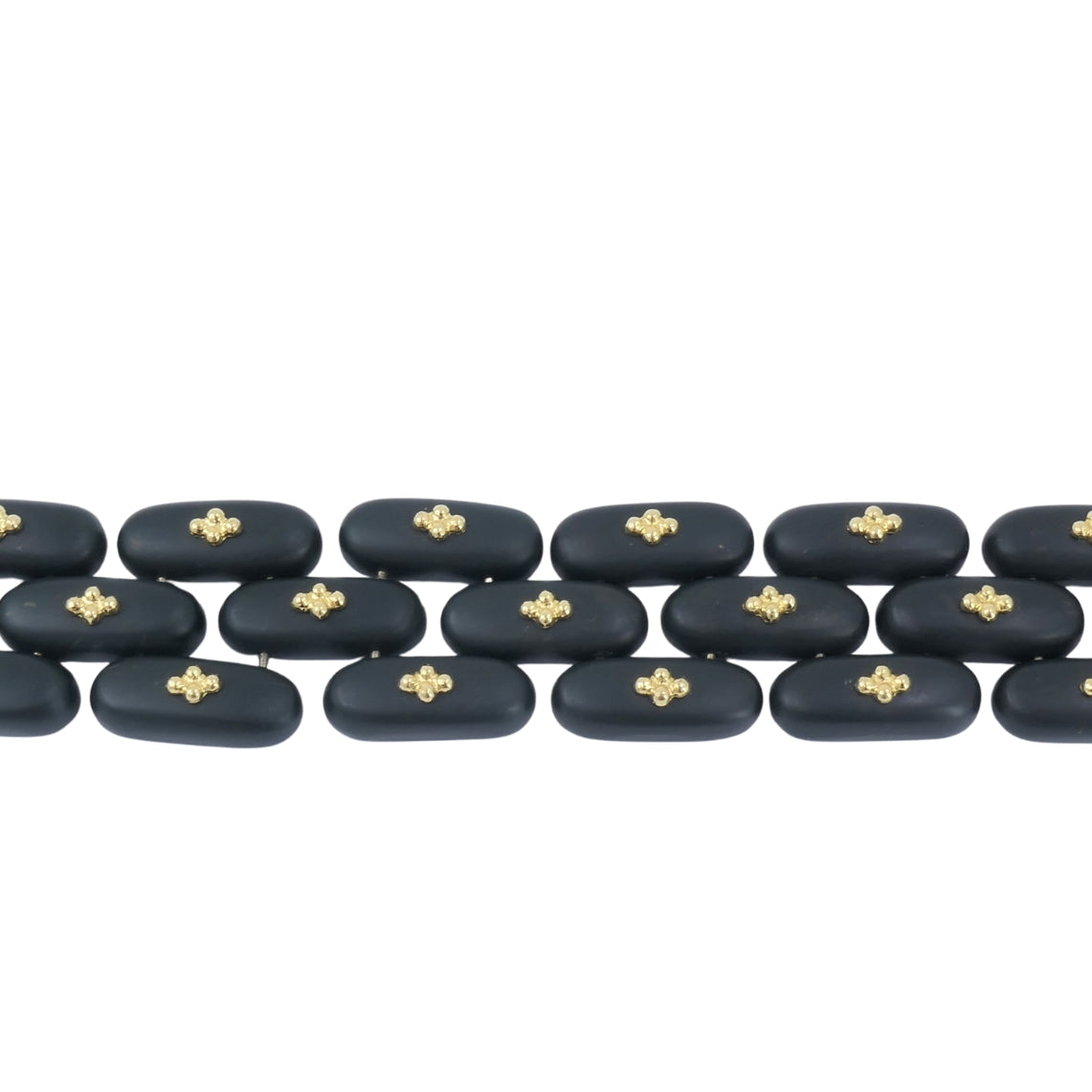 The bracelet is composed of smoothly contoured black jade links, each framed and connected by gold elements. Angela Cummings is known for her organic yet architectural approach to jewelry which is beautifully reflected in this design. The clean lines and repeated link pattern give it a confident presence while the contrast between the deep, matte black jade and the gold create a visual rhythm. The use of black jade is adding depth and character to this vintage bracelet.