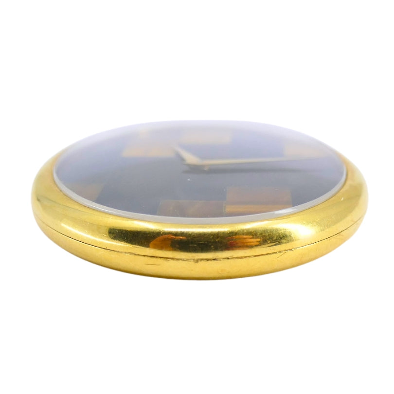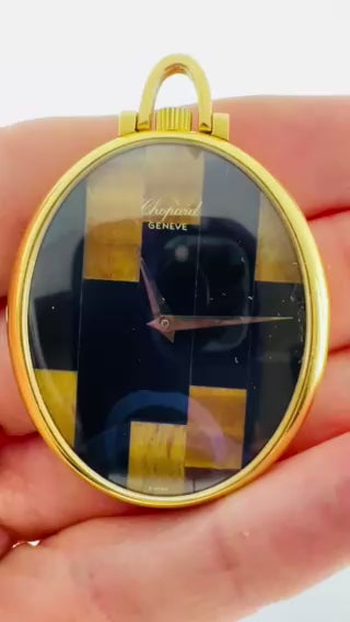 A vintage Chopard watch pendant, crafted in 18k gold, Swiss made. The watch features a smooth oval case with clean lines and gold hands. The face combines deep black onyx with warm tiger’s eye in a bold geometric layout. Designed as both a timepiece and a jewel, this Chopard watch makes for a chic pendant.