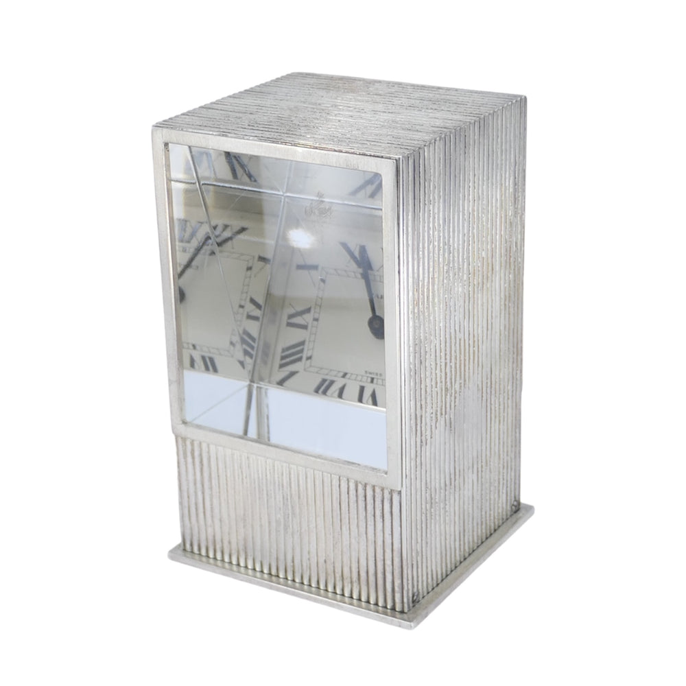 Crafted from gleaming sterling silver, the clock presents a seemingly empty prism. Yet, upon closer inspection, the magic unfolds. Through a clever interplay of mirrors and hidden hands, the time reveals itself, numerals appearing as if suspended in mid-air. This illusionary design is a testament to Cartier's mastery of watchmaking artistry, offering a glimpse into the world of their renowned “Mystery Clocks.” Quartz movement with Roman numeral dial.
