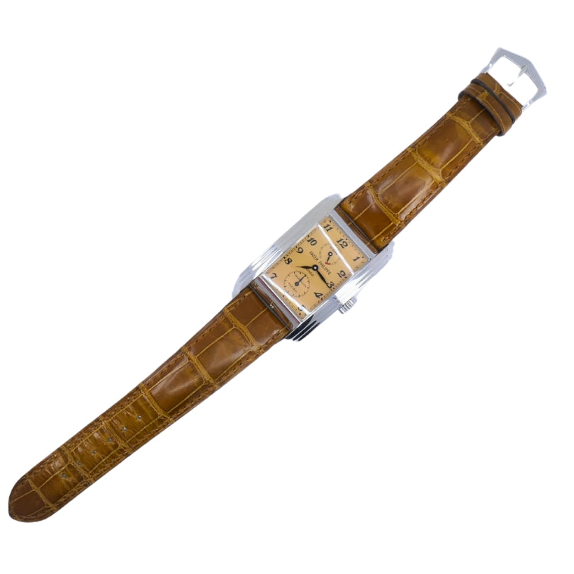 The Patek Philippe Reference 5101P 10-Day Tourbillon is a masterpiece of mechanical sophistication and understated elegance. Crafted in solid platinum, its distinctive rectangular case features Art Deco-inspired stepped sides. The warm salmon dial displays the power reserve indicator at 12 o’clock and the small seconds at 6 o’clock. Elegant Breguet numerals and leaf-shaped hands complete the refined aesthetic.
